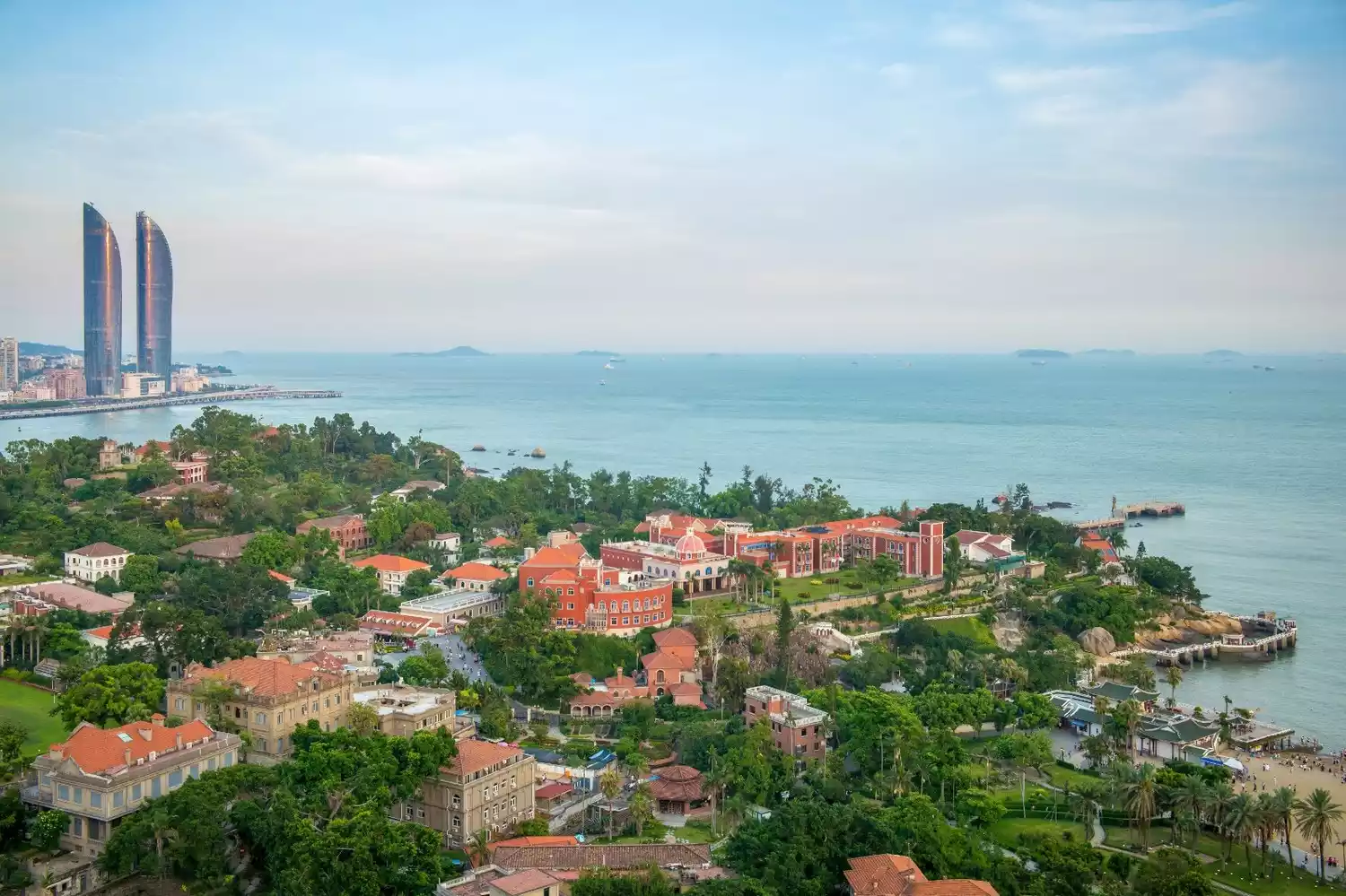 If you fly over Xiamen by plane, you will definitely see this green island full of buildings. If your plane takes off from the east-to-west runway of Xiamen Airport, your plane will also soar over Gulangyu Island after takeoff.