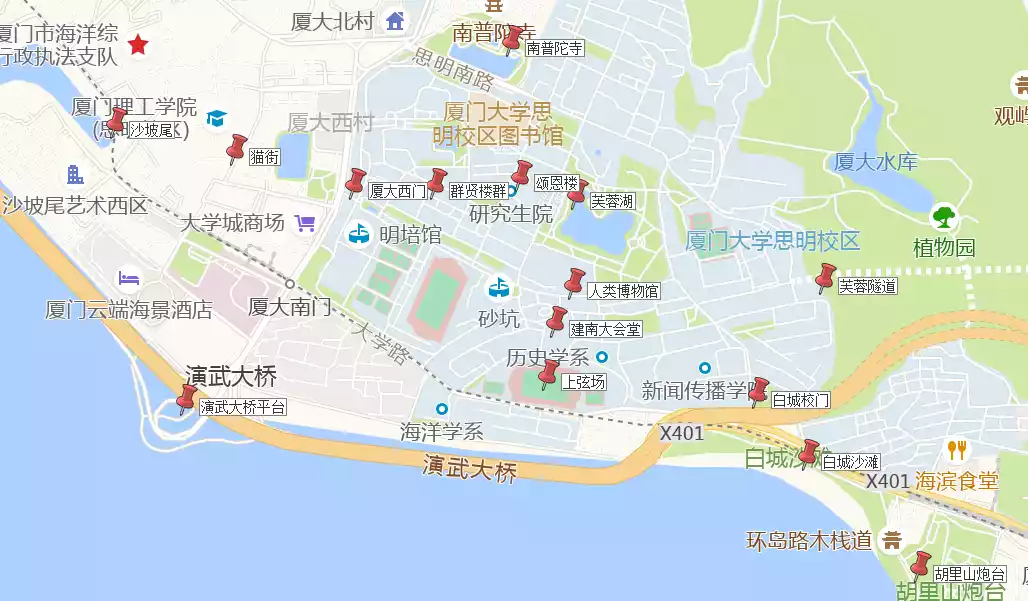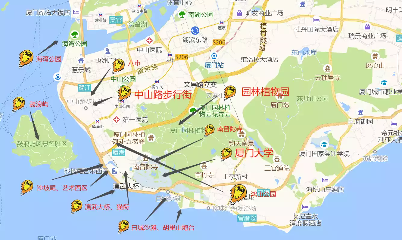 Recommended spots in Siming District include: Zhongshan Road, Eight Markets, Xiamen University, Putuo Temple, Ding'aozai Cat Street, Shapowei, Baicheng Beach, Twin Towers, Yanwu Bridge, and Hongshan Park.