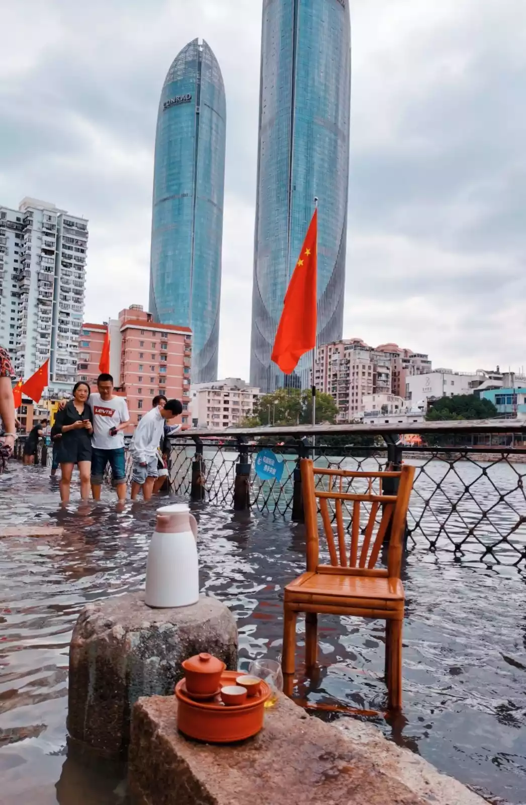 Strolling along the several hundred-meter-long wooden boardwalk by the water, no matter where you stop, you can look up at the iconic Twin Towers, where the contrast between history and modernity is presented in a vivid and harmonious way.