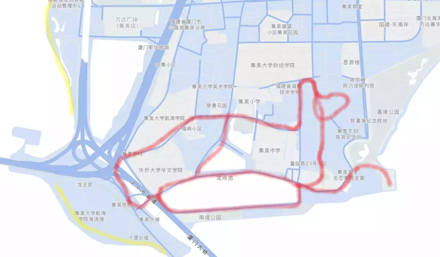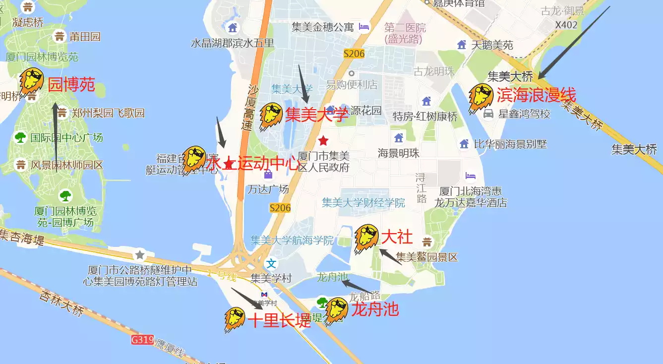 2️⃣【Jimei District】: Jimei University Village, Dragon Boat Pond, Jimei University, Water Sports Center, Ten-mile Causeway, Dashe, and the coastline around the East China Sea...