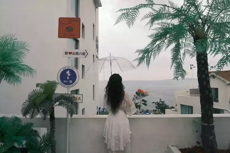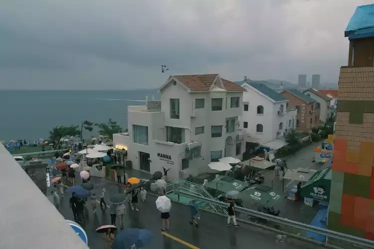 There are colorful two-bedroom single-family houses on the road, and at the end of the road is the boundless sea with boats swaying on the sea. Against the backdrop of heavy rain, it is like a dream, with a unique charm!