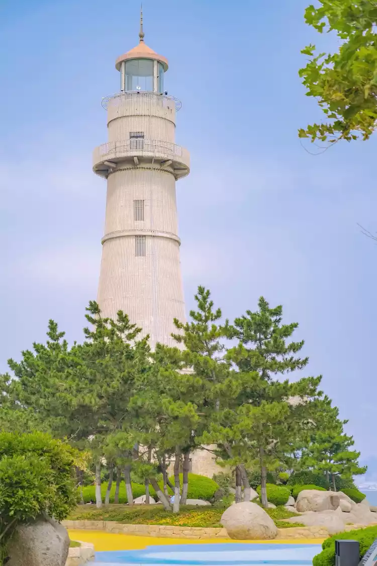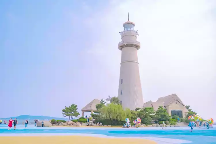 Our first stop was Yuehai Park. This park, situated across the sea from Liugong Island, stretches 1.3 kilometers, bordering Weihai Park to the north and Haishang Park to the south. The park's central square features a landmark building: a 49-meter-tall sightseeing lighthouse. Beneath the lighthouse are a striking array of seaweed houses. These thatched houses are the traditional dwellings of Weihai fishermen, offering warmth in winter and coolness in summer, and lasting for centuries without rotting.