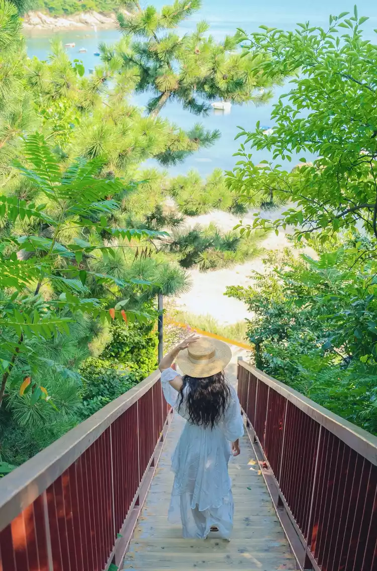 Continue walking forward, there is a wooden staircase leading to the beach, with lush trees planted on both sides. The summer sun shines through the leaves onto your face, and the mottled light and shadow are dotted, which is really beautiful for taking portraits.