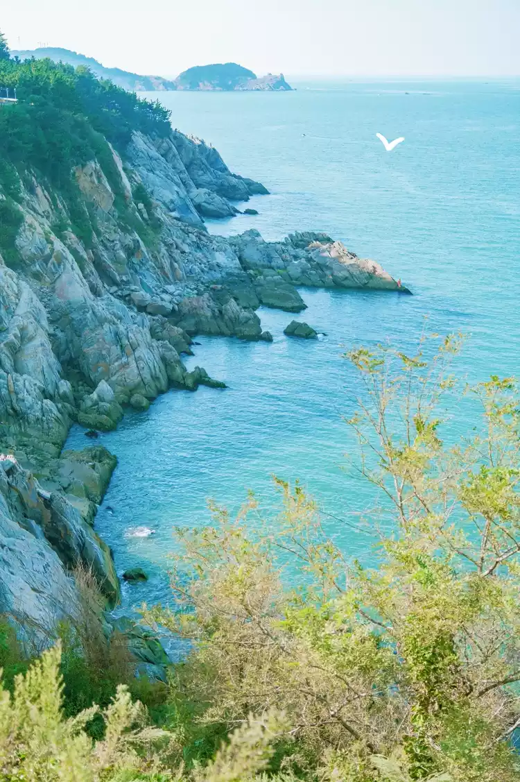 After stopping for a while, the sun finally came out. Xiao Yao continued to walk left along the coastline, climbed up the wooden plank road, and finally saw the glass sea of Weihai.