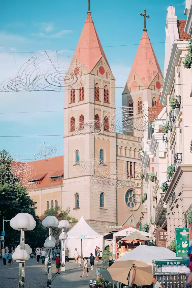 As soon as you exit the subway, you'll see a German-style building with red tiles and yellow walls, and the spire of Qingdao's landmark church, St. Michael's Cathedral, is faintly visible.