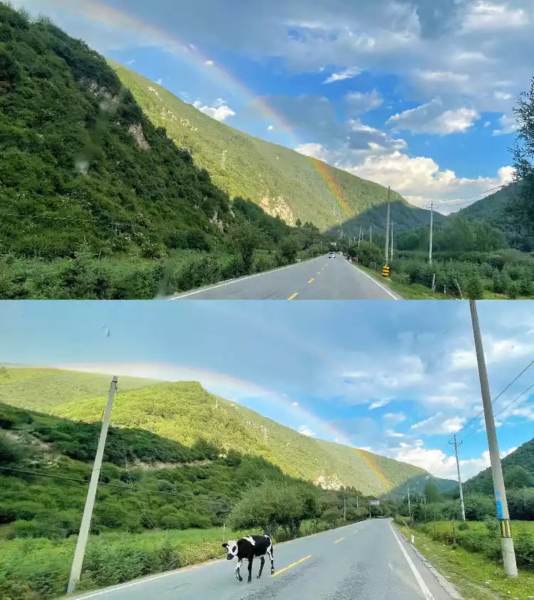 The rainbow accompanied us along the way, and my friends all shouted that they were lucky to have seen the colorful auspicious clouds and experienced the wind and sand. At this moment, we set out on the return journey accompanied by the rainbow. Under the snow-capped mountains, there are thousands of miles of grasslands with thousands of miles of flowers blooming. I walked through the snow on the Qilian Mountains outside the Yumen Pass, and also walked through the boundless grasslands with thousands of sheep and wild flowers blooming.