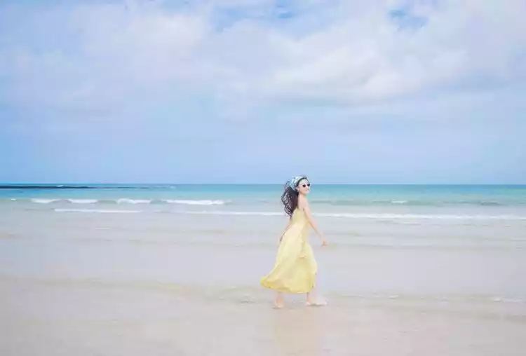 The long coastline, the endless blue jelly sea, the black reefs, the white sand beach, the green plants, the blue sky, the white clouds and the sunshine are as beautiful as a painting!