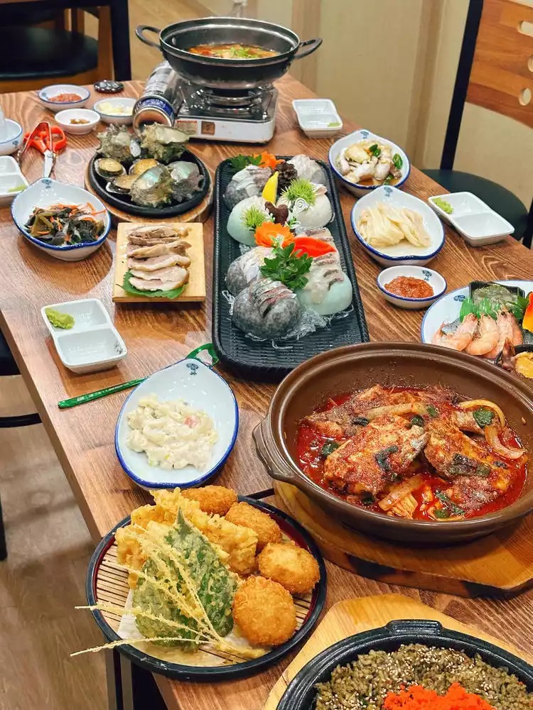 After enjoying the beautiful sunset, we decided to go back to the city for dinner. On the way, we chose a Korean sashimi restaurant. When we arrived at the restaurant, we were really amazed.