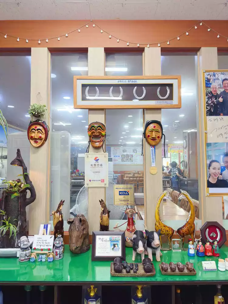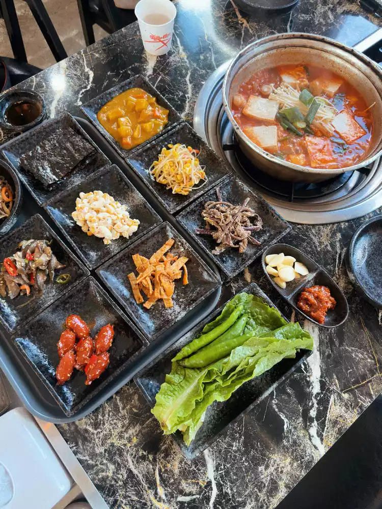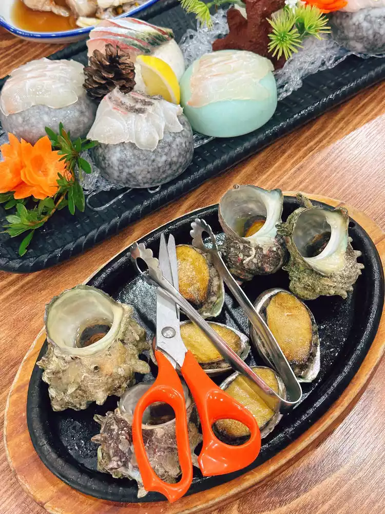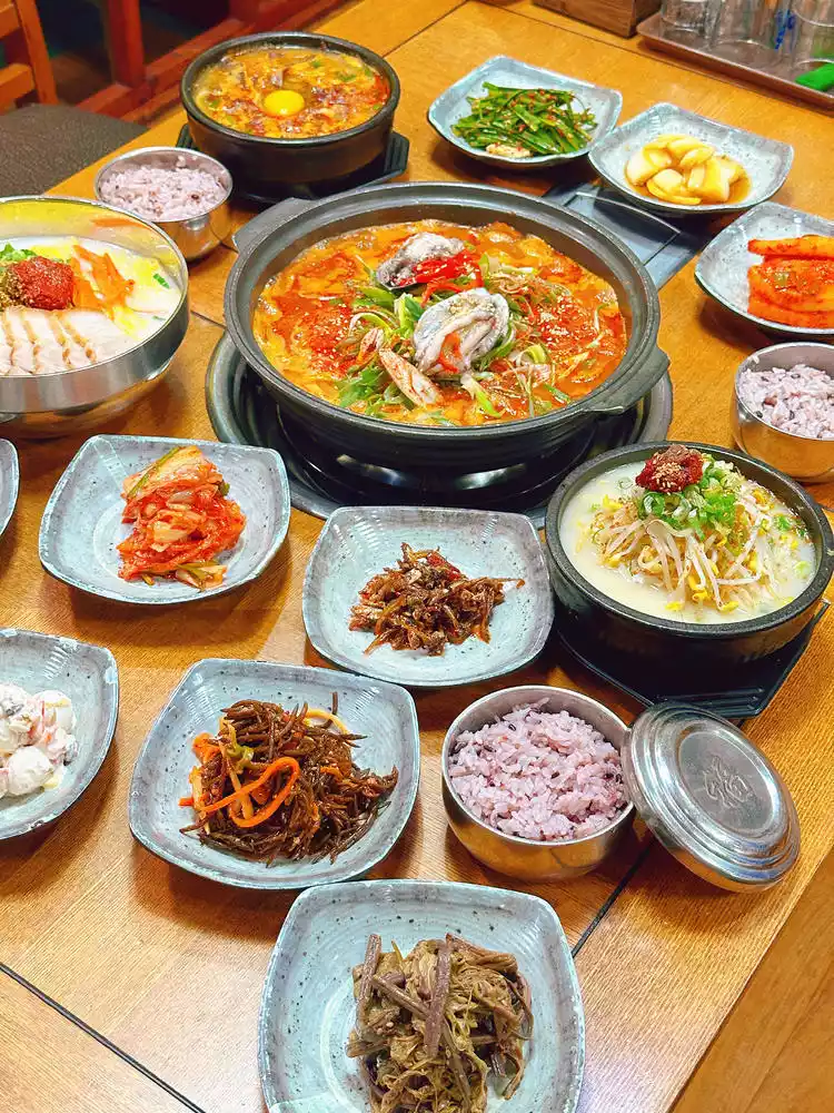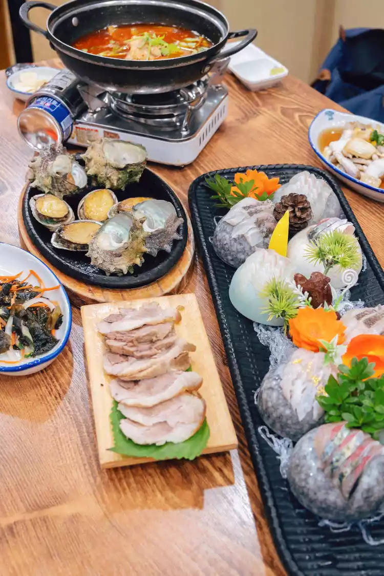 The restaurant is quite large, with a wide selection of set meals. We ordered the live abalone seafood hot pot, which came with a large table of side dishes and pork bone ramen. Their most classic dishes are the hangover soup and beef soup rice, which were warm and satisfying.