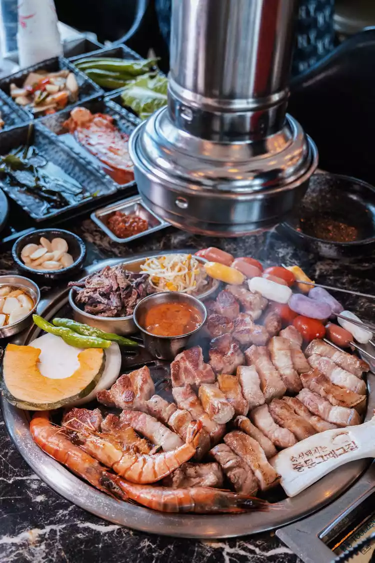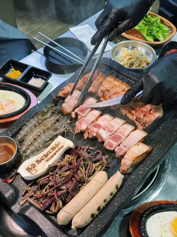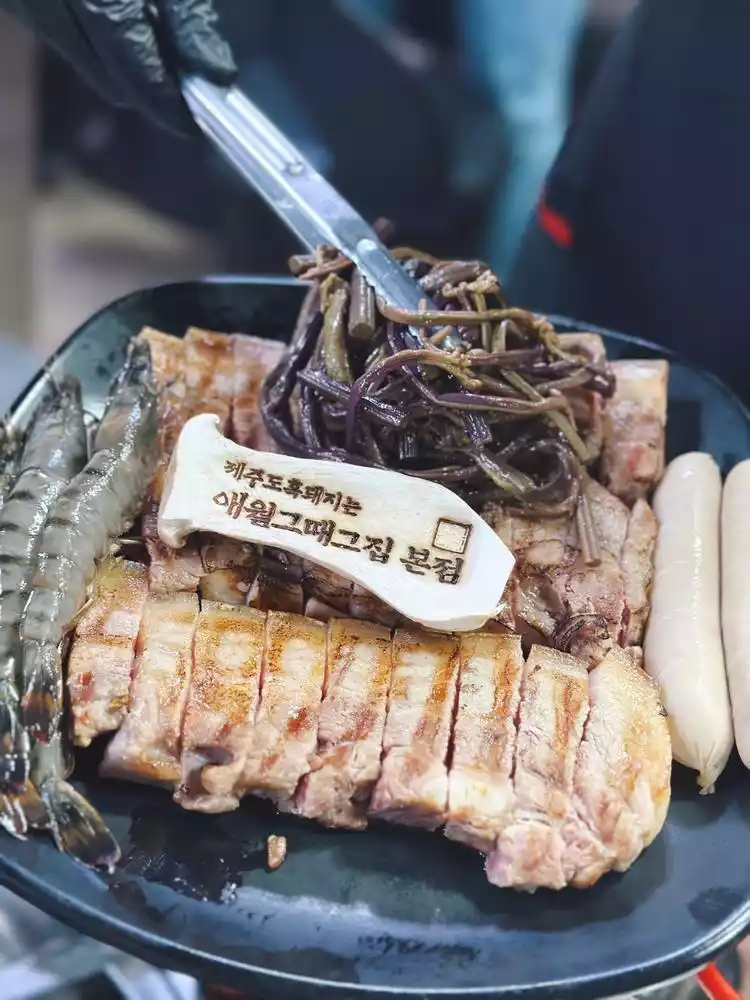 The meat is super firm and delicious. It is grilled with Jeju Island's special longevity vegetables. It can help you eat meat while also getting rid of the greasiness.