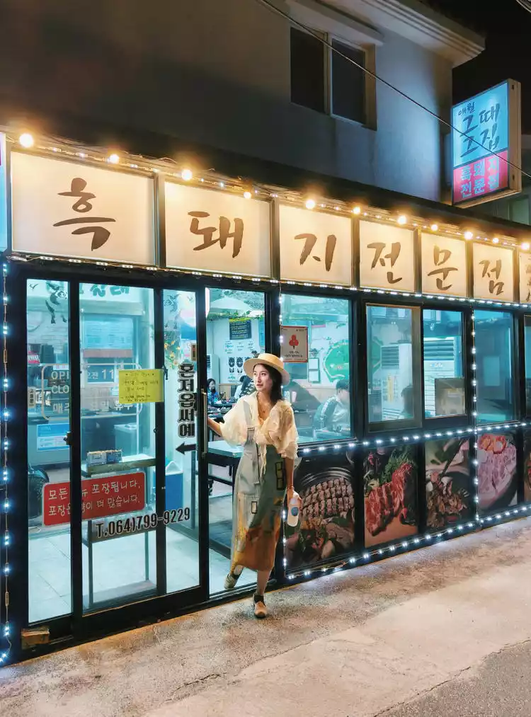 After finishing our shopping, it was almost lunchtime. There was a black pork roast shop near the souvenir shop. We had dinner at Aewol on our first day on the island and couldn't stop thinking about it. So we decided to visit their branch in the Chinese area, Jeju Happy Pig. It's so delicious when you roast it!