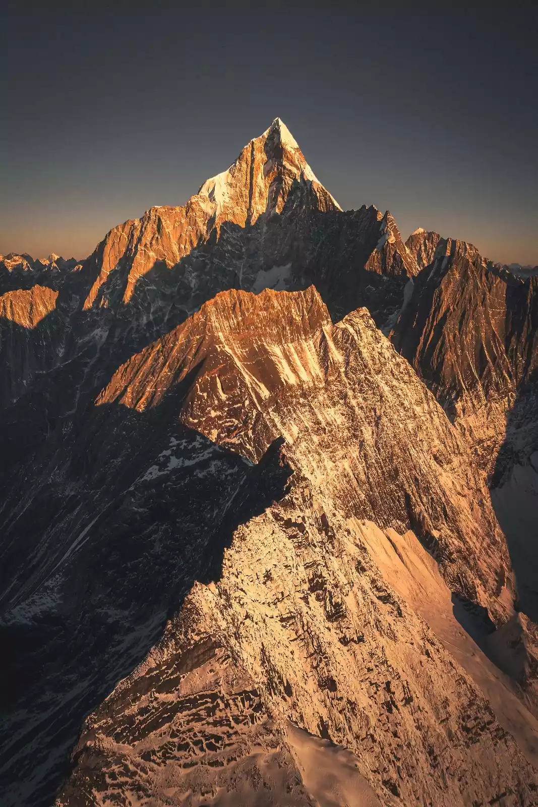 Shanuoduoji, meaning "Vajrapani Bodhisattva," is the eastern peak of the Three Protectors Snow Mountain and ranks third in the Buddhist hierarchy. Its main peak is a triangular pyramid, the closest in shape to a pyramid among the three. Sharp ridges wind along its flanks, with the side facing away from the light appearing dark, a sharp, defined line against the blue sky.