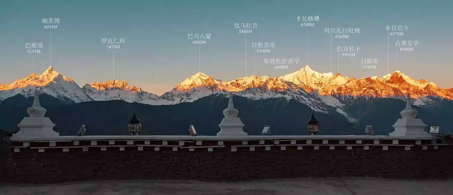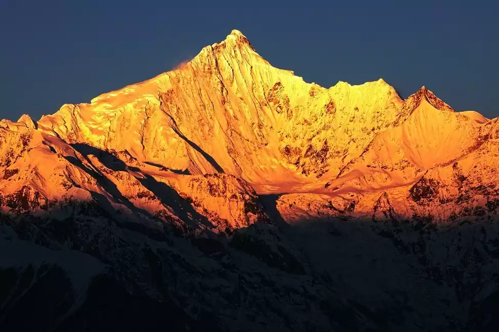 Meili Snow Mountain is located at the top of the Eight Sacred Mountains. Its main peak, Kawagebo, is the highest peak in Yunnan Province and is recognized as the most beautiful snow mountain in the world. It is known as the "God of Snow Mountain". The golden light descending from the sky shines on the top of the snow mountain, like a golden "Potala Palace", which is extremely spectacular.
