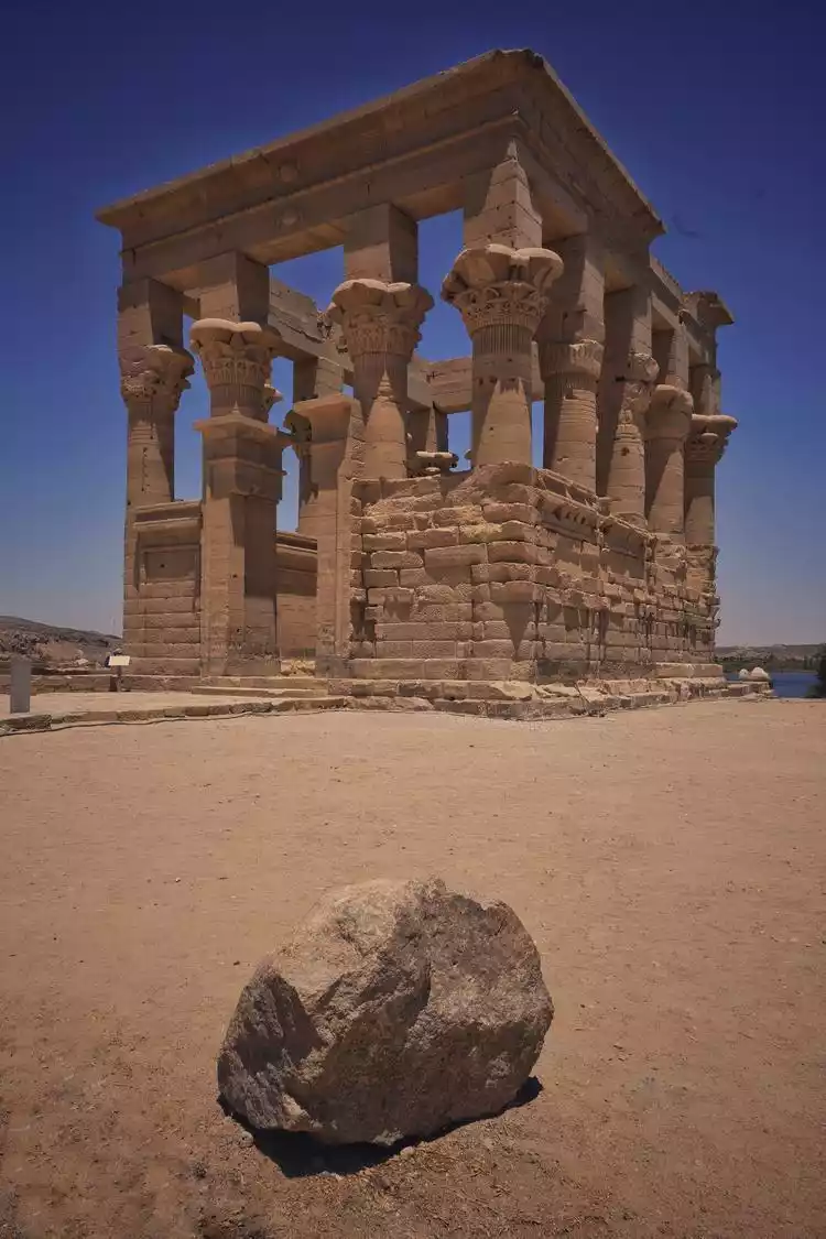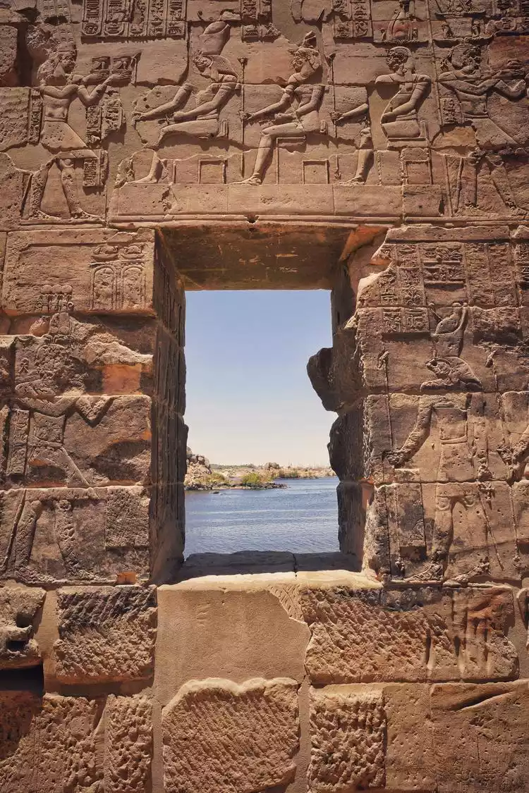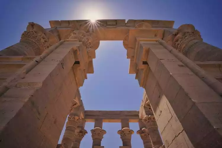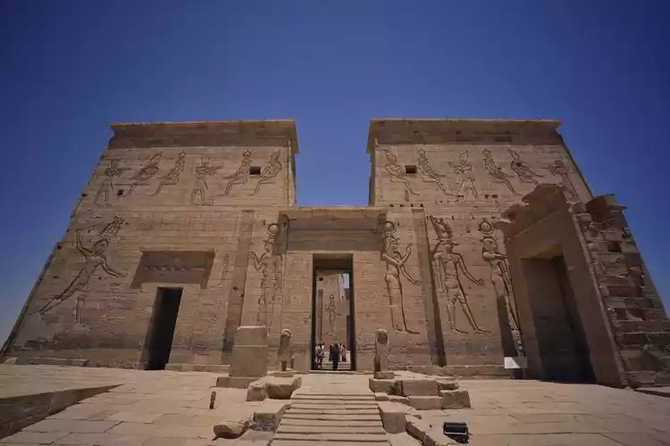 The Philae Temple is dedicated to the goddess of love, Isis. Philae is a small island in the Nile River south of the Aswan Dam. Originally, a temple was built on the island. Construction of the Aswan Dam by the British in 1902 submerged Philae Island, leaving visitors only able to view the temple's gate and pillars, which remain above water, by boat. The Philae Temple boasts hieroglyphic inscriptions and vivid reliefs, honoring deities such as Hathor, the goddess of wealth, and Isis, the goddess of fertility.