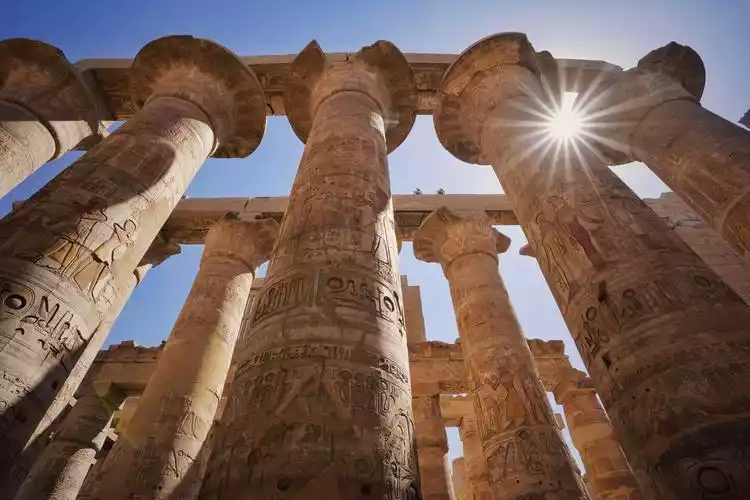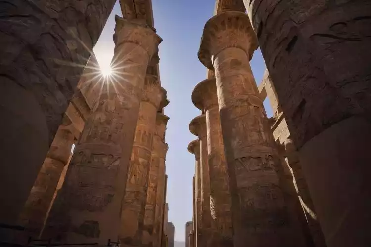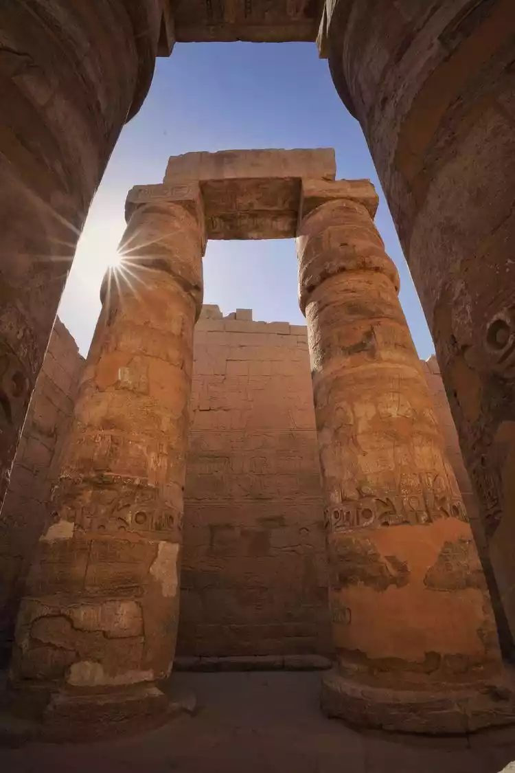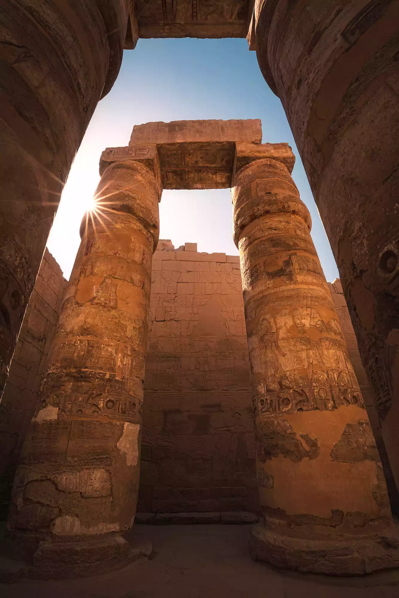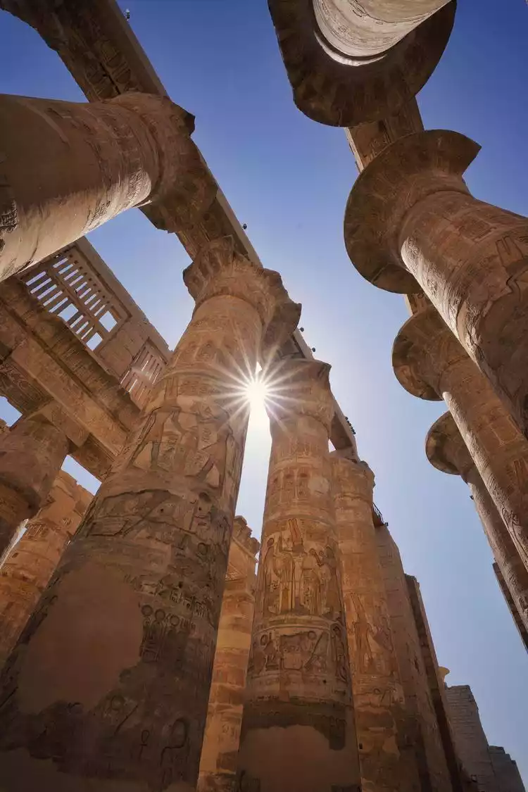 The Karnak Temple in Luxor is a magnificent temple. It was the center of worship for the sun god Amun and the largest temple in ancient Egypt. The Hall of the Pillars is the most spectacular, making it ideal for shooting the pillars from a low, ultra-wide-angle camera, with the sun as a backdrop for capturing starbursts.