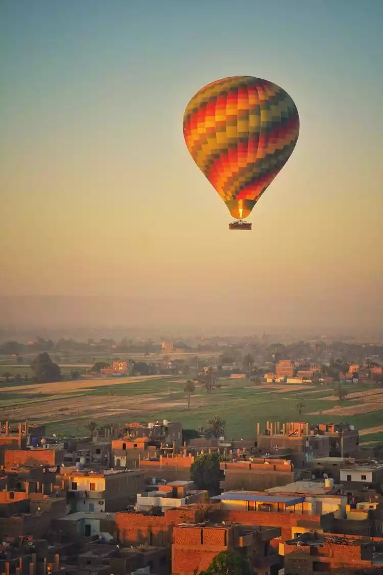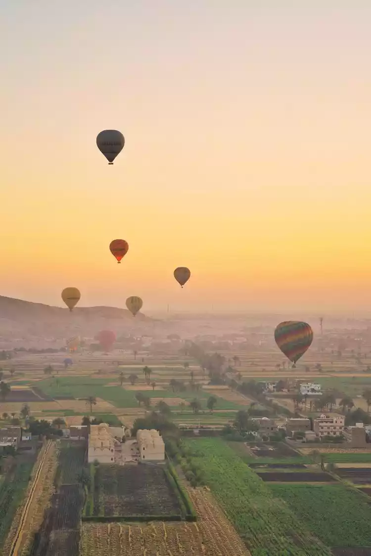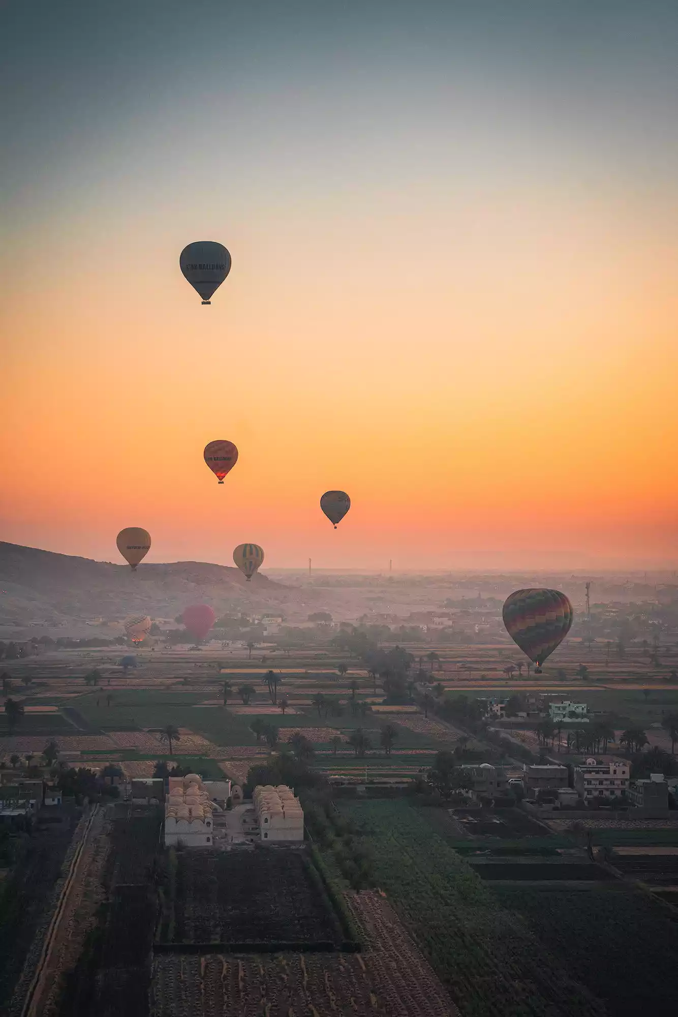 From a hot air balloon, you can enjoy breathtaking aerial views of the Nile River at sunrise. You'll need a telephoto lens to capture these stunning moments, but sometimes the balloon company won't let you bring a camera due to weight constraints, so you'll have to use your phone. Sometimes, however, you can still do this, so it's recommended to bring a camera bag or place your camera in a separate backpack. Otherwise, the balloon company might ask you to remove the camera bag if it's too bulky.
