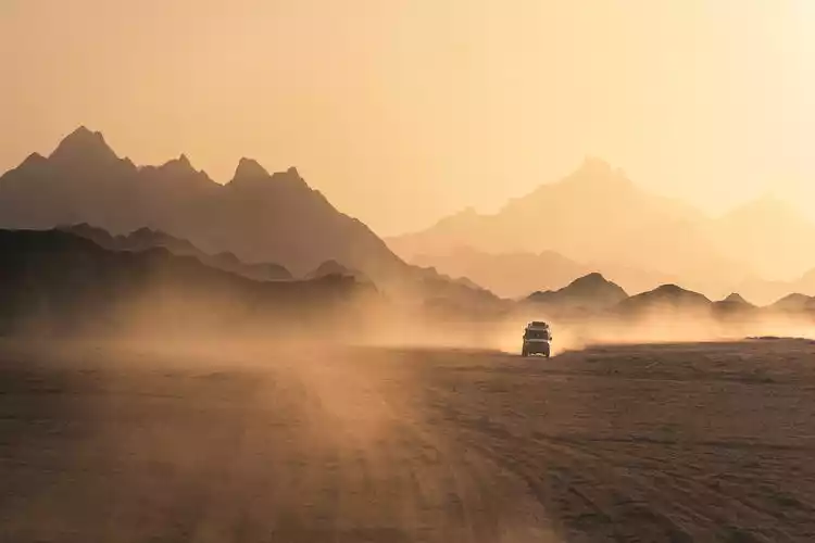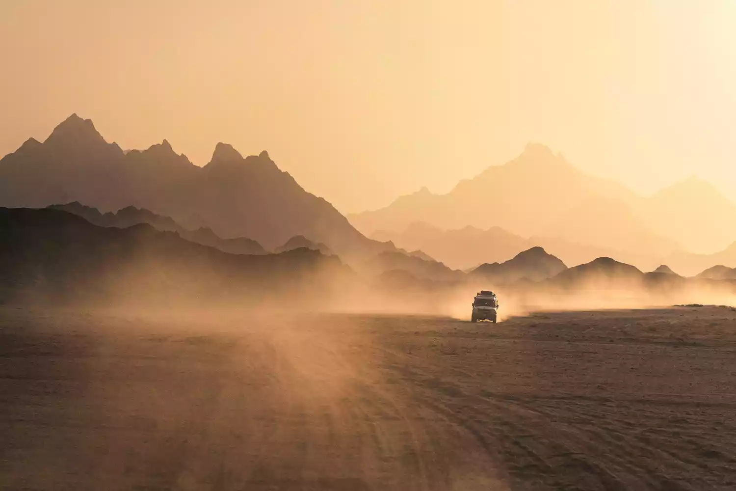 The road from Hurghada on the Red Sea to the Bedouin village is completely deserted. The SUV speeding past, backlit before sunset, creates a rich atmosphere.