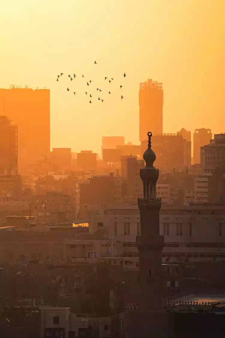 This photo was taken in Cairo's Al-Azhar Park. It's a relatively off-the-beaten-path spot, with few tourists, but many local newlyweds come here for outdoor photography. The park also has a viewing platform, which is a great spot for capturing the Cairo cityscape at sunset. Many local homes keep pigeons on their rooftops, so there are often flocks of them flying around, as I captured in this photo.