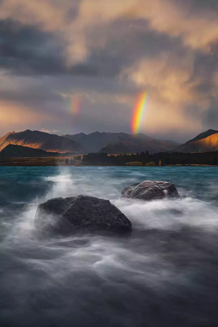 Leaving Christchurch, we headed straight for Lake Tekapo. This glacially-dammed lake is one of the world's best stargazing spots and the largest dark sky reserve. We were also very lucky to witness a rainbow sunset over Lake Tekapo.
