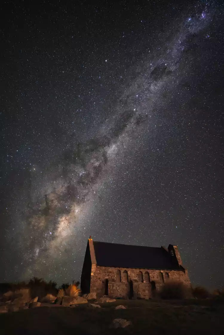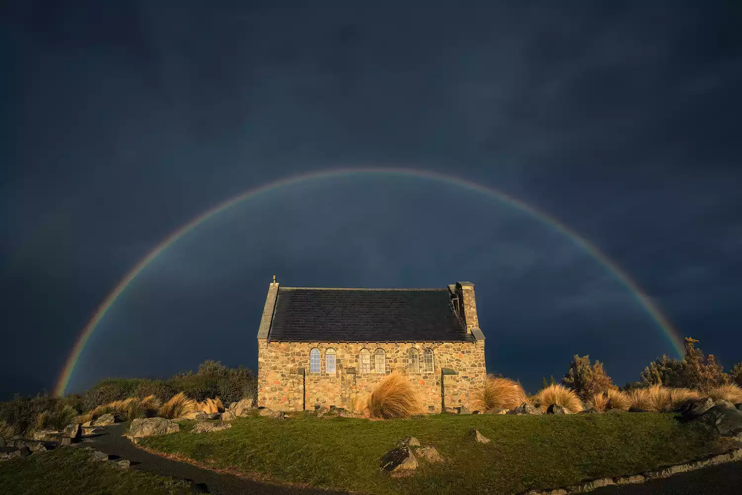 Located right on the shores of Lake Tekapo, it's a great spot for stargazing. When we first arrived at Lake Tekapo, the sky was overcast and dark, but at sunset, a sun shower appeared, and a rainbow appeared, right above the Good Shepherd.