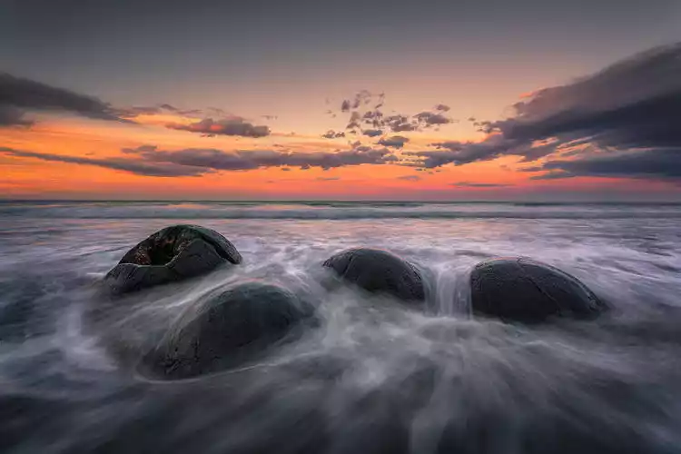 The Moeraki Boulders, located on New Zealand's east coast, are the final photography location on this itinerary. The formation of these circular boulders remains a mystery. High tide at sunset creates a large splash, perfect for capturing slow-motion shots with a shimmering or foggy effect.