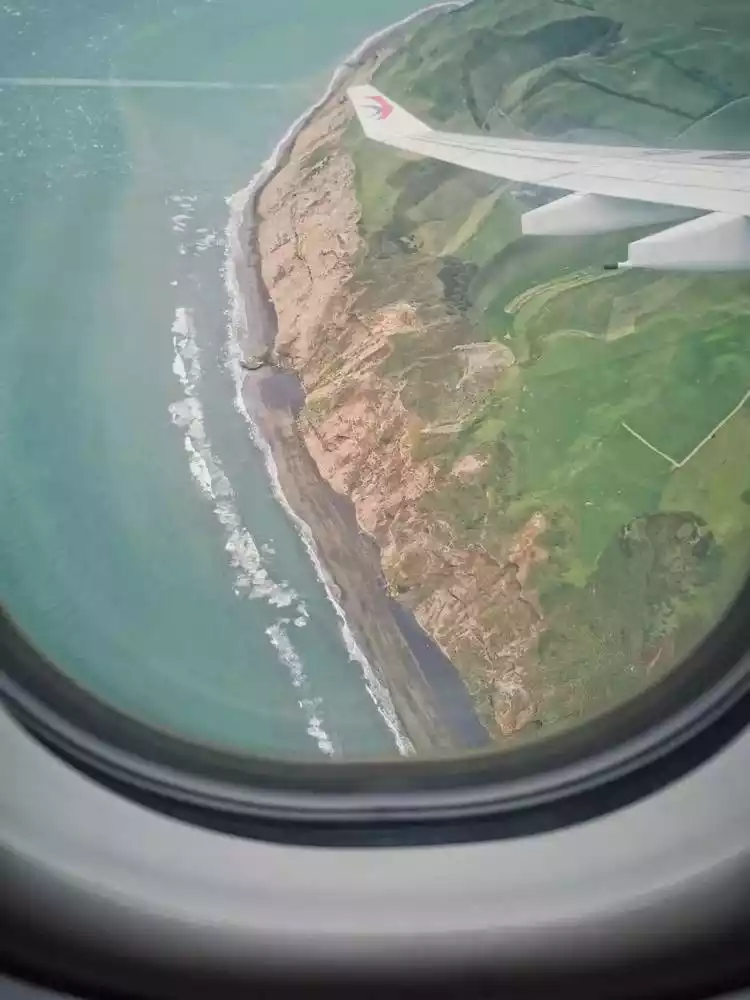 Our flight landed in Auckland in the afternoon, so it was daytime there. As the plane slowly descended, we could see the coastline of New Zealand's North Island through the window.