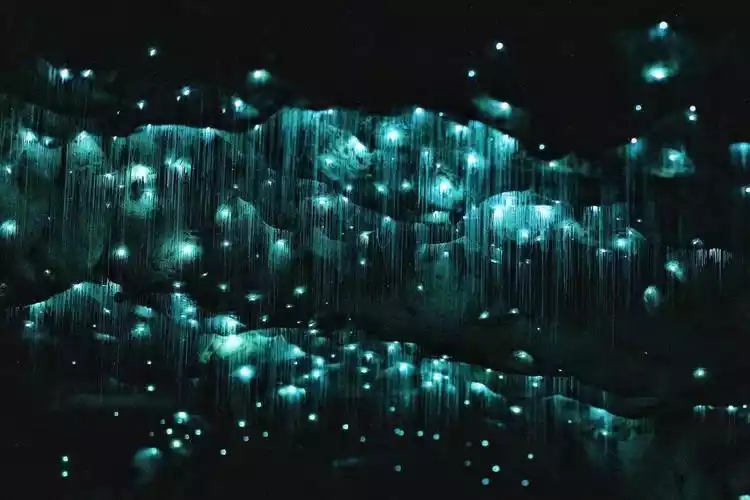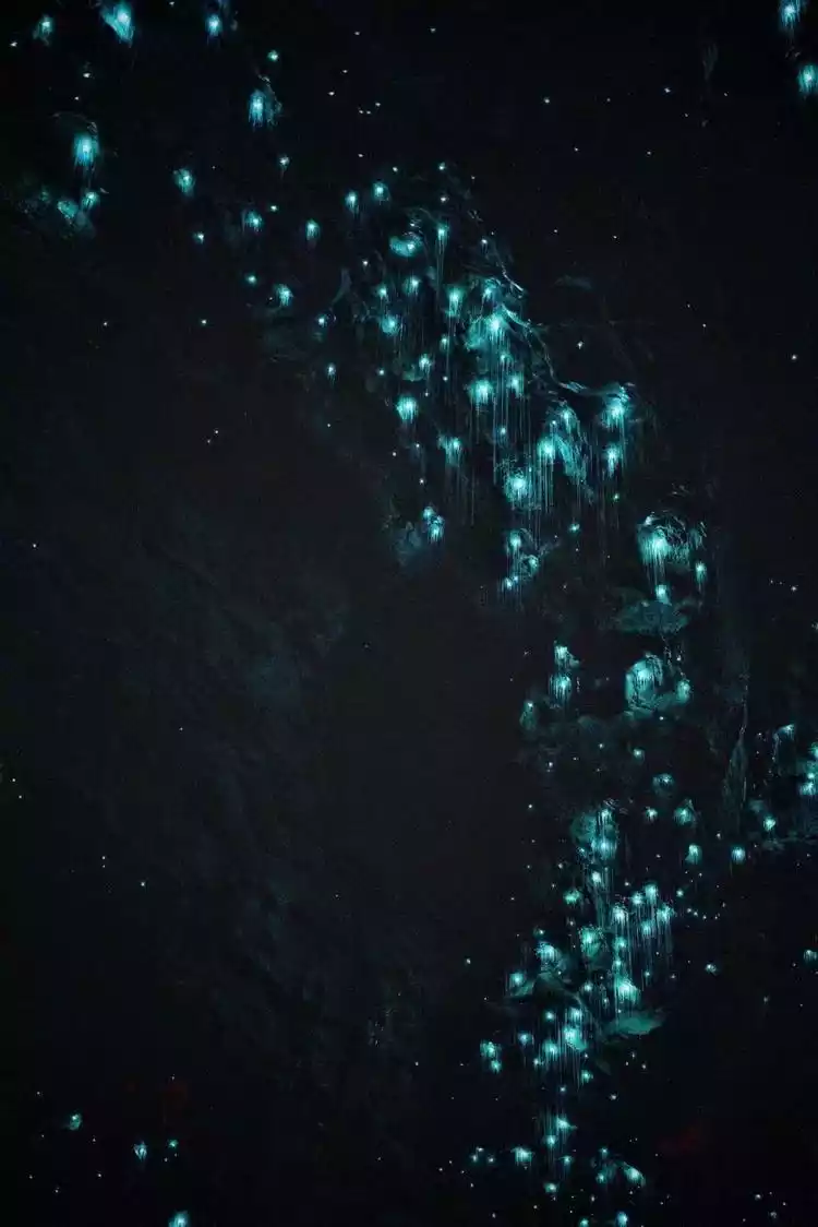 The first place we visited was the Waitomo Glowworm Caves. This is the blue glowworm larvae. Unlike the common glowworms we see, they prefer to live on stalactites in caves. Like spiders, they spin silk, using their own light to attract other insects, which they then reel in to feed on. The brighter the glow, the hungrier it is.