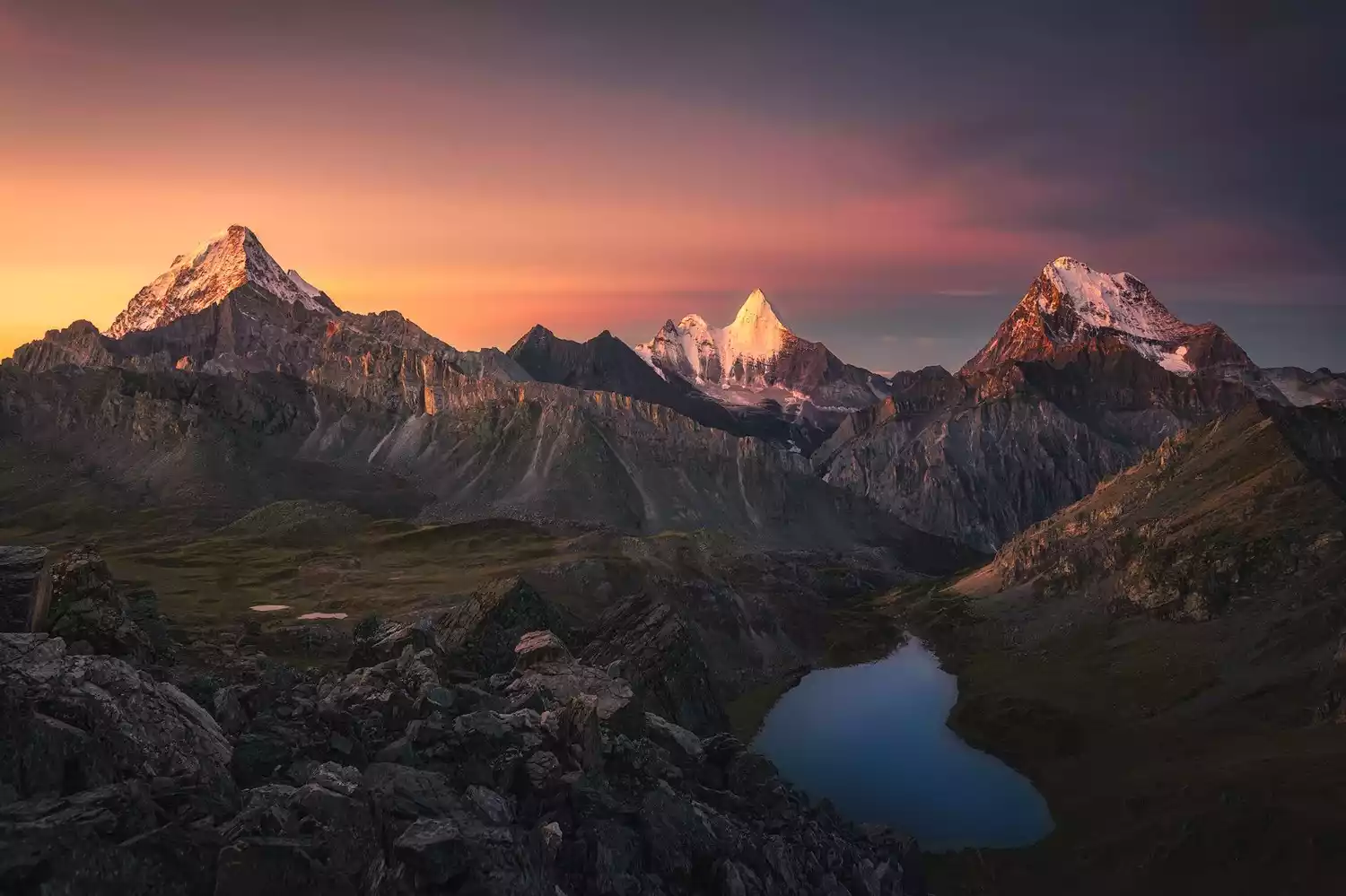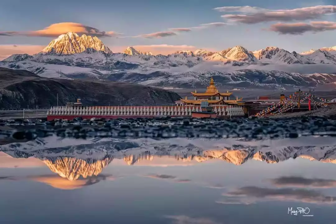 Xianuoduoji represents Vajrapani Bodhisattva. Its main peak is a triangular pyramid, similar in shape to a pyramid. In Buddhism, it is a sacred mountain that protects against violence and brings peace to the people. At its foot, Luolong Ranch is where Mr. Locke once camped. Of Daocheng's three sacred mountains, Xianuoduoji offers the most beautiful sunsets. The Chonggu Temple Observation Deck and Luolong Ranch are ideal spots to capture the sunset. Compared to Chonggu Temple, Luolong Ranch offers a wider view of the snow-capped mountains, providing better lighting.