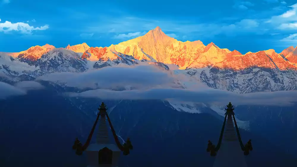 The gods of the snow-capped mountains, the Thirteen Peaks of Meili are all known as "immortals practicing in the Prince's Palace". The Sun Shining on the Golden Mountain usually occurs in the early morning of a clear day. The golden light shines on the top of the snow-capped mountain, like a glowing "Potala Palace". The best time to view the Meili Snow Mountain is from October to May of the following year. There is little rainfall, the air is clean and the transparency is high. At that time, there is more than 80% chance of encountering the spectacle of the Sun Shining on the Golden Mountain.