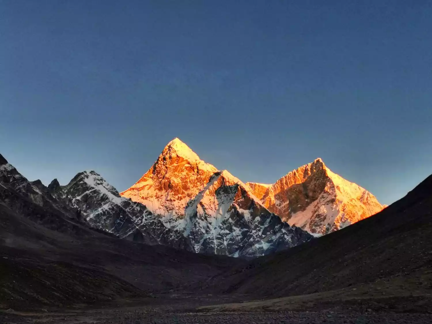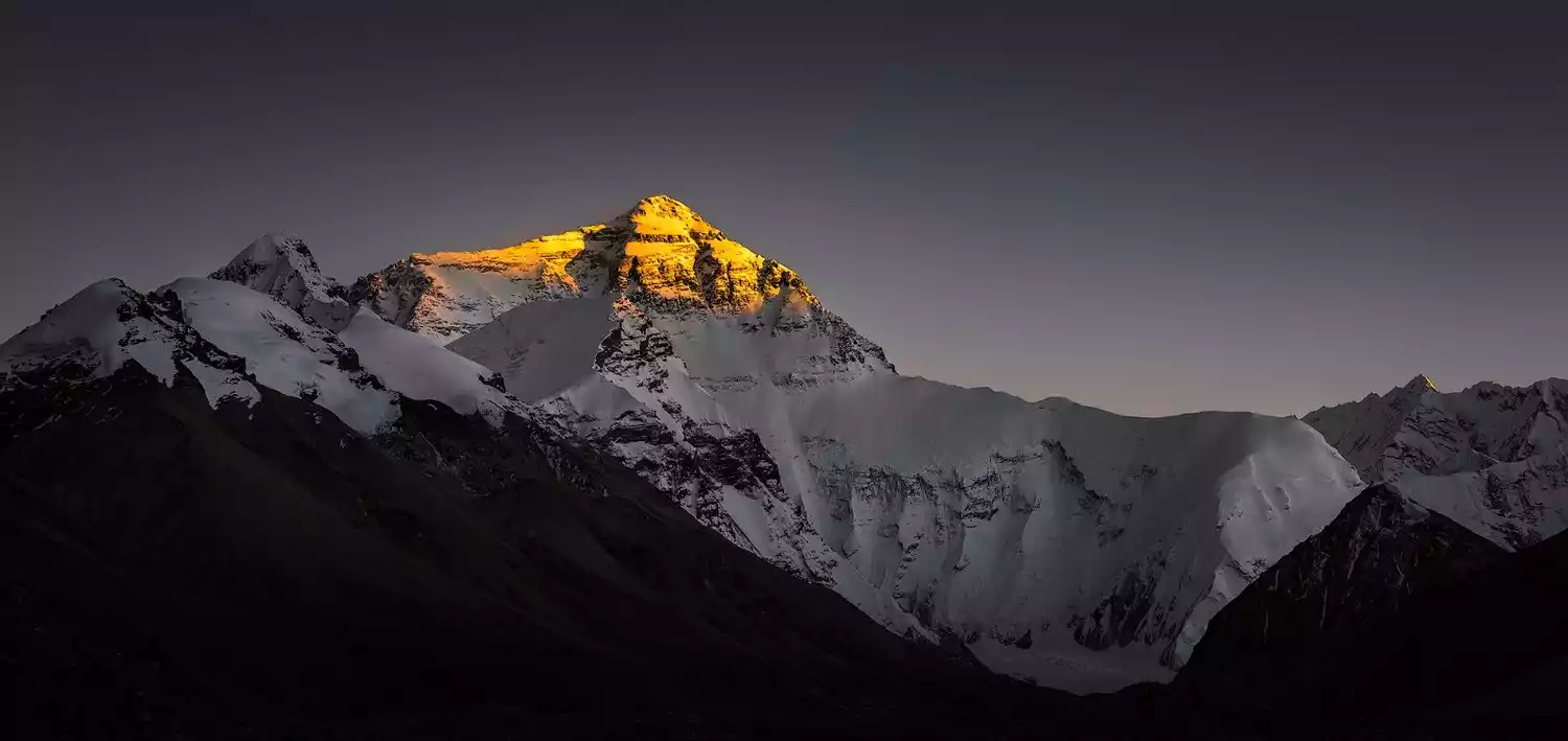 The world's highest peak, in the shape of a pyramid, is regarded as a sacred symbol. Every time the sun rises over the main peak, the huge mountain is illuminated by the red light and looks gorgeous. Both sunset and sunrise can produce an intoxicating effect of the golden mountain. The sunlight bathes the mountain in golden light, and the clouds are still lingering, like small pyramids that appear and disappear from time to time, making it even more mysterious.