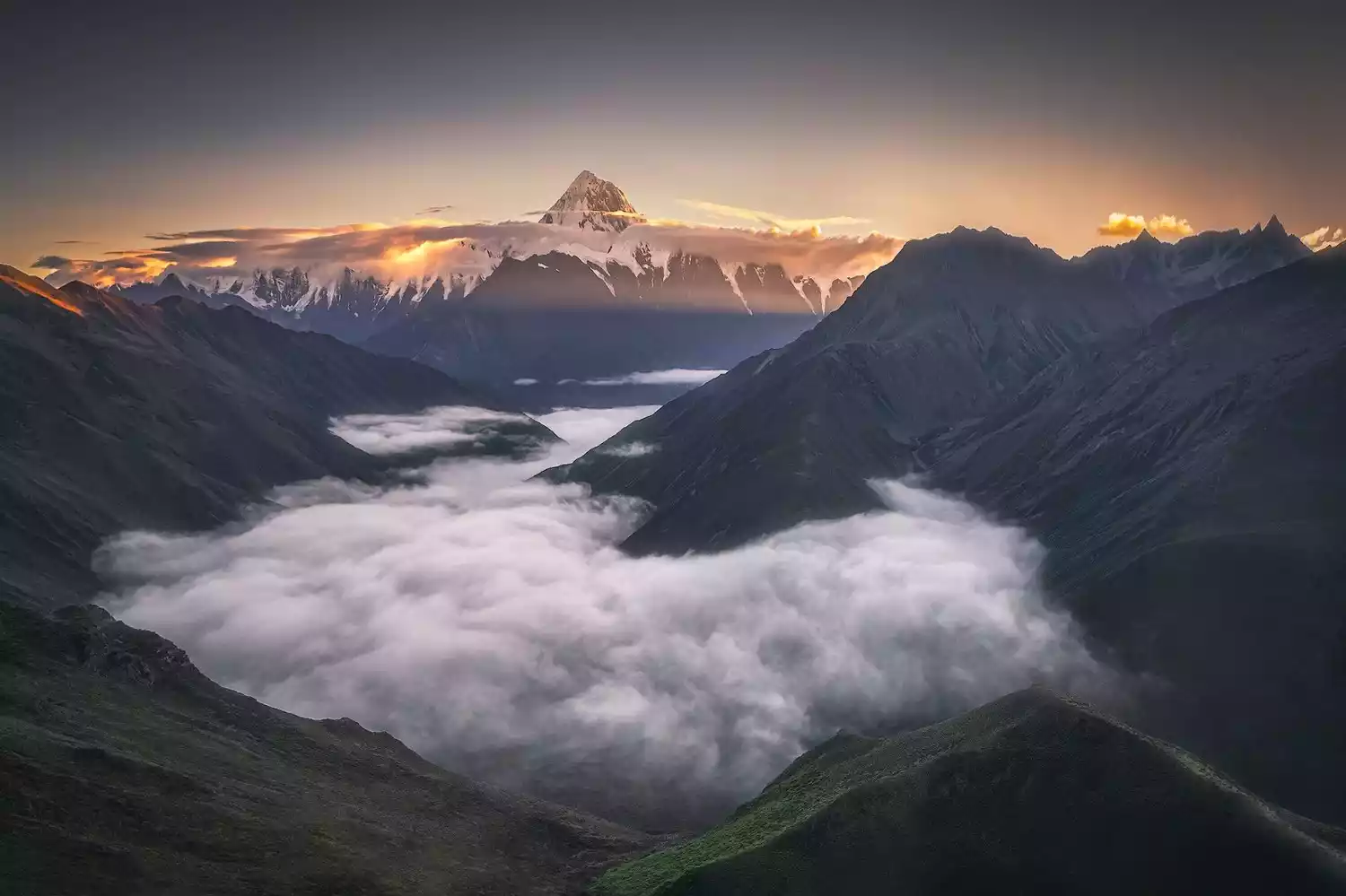 One of the four sacred mountains in Tibet, known as the "Second Shambhala," the mountain commands immense local prestige. It is the first snow-capped mountain traversed on the Sichuan-Tibet Tea-Horse Road and is ranked among China's ten most beautiful snow-capped mountains. A pristine, pure-white rectangular pyramid, the Yala Snow Mountain is nicknamed the "White Yak of the East." The sun's golden glow is truly breathtaking. Morning light pierces through layers of mist at its summit, shrouding the lotus-shaped mountain in golden light, giving it a rose-gold sheen that is breathtakingly beautiful.