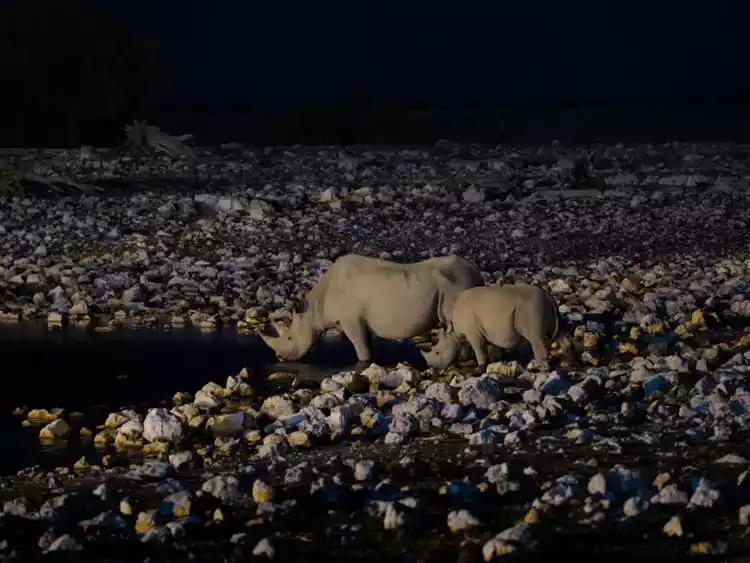 Under the moonlight at night, a mother and daughter rhino play in the pond