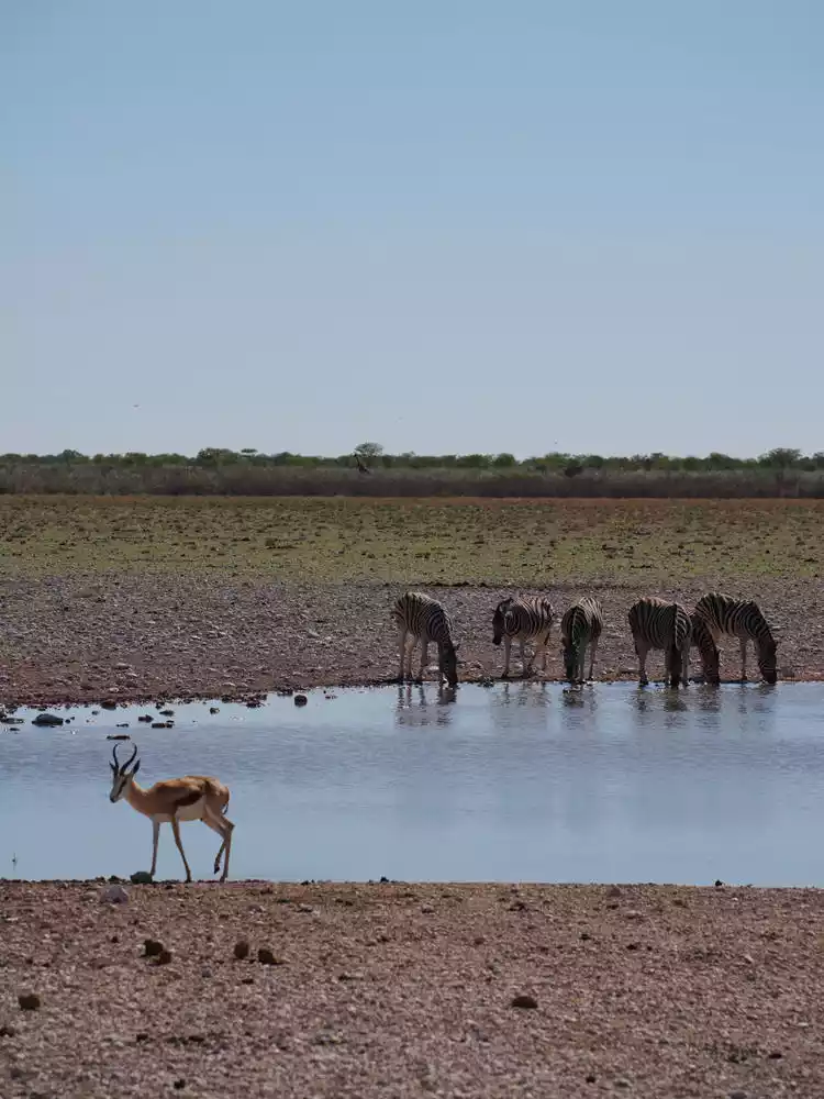 On the morning of day eight, we reentered Etosha National Park for an animal safari. We were incredibly lucky right after entering! We spotted lions, jackals, and crows – a truly adorable spectacle. We saw zebras drinking water and oryx pooping – all adorable little critters.