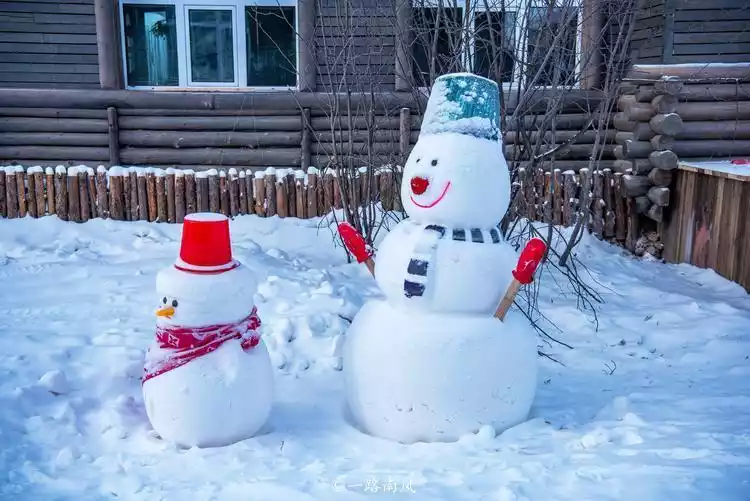 Entering Lengji Village, my friends were all excited. The cabins, the snow, the snowmen, the ice and snow park, the nearby railway tracks, the distant forest, the smoke from cooking, the blue sky, and the white clouds formed a beautiful and dreamy scene.