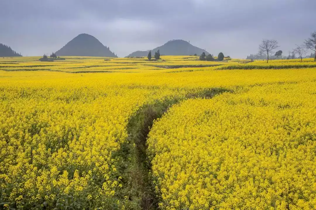 🌟Highlights: 800,000 mu of rapeseed flowers stretch for dozens of miles. Climbing Jinji Peak in the northeast of the county seat, you can see that the rapeseed fields are relatively flat, while some isolated peaks rise in the distance, which gives you a magnificent feeling.