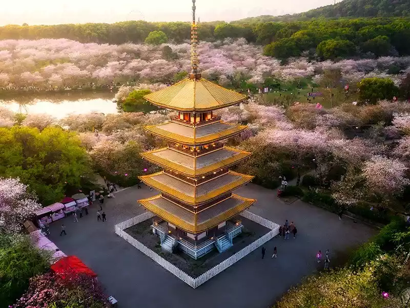 🌟Highlights: Known as one of the most beautiful cherry blossom gardens in the world, it covers an area of more than 24,000 acres and has more than 700,000 cherry trees. The cherry blossoms cover the ridges and are close to Gaofeng Mountain, like a pink ribbon surrounding Hongfeng Lake.