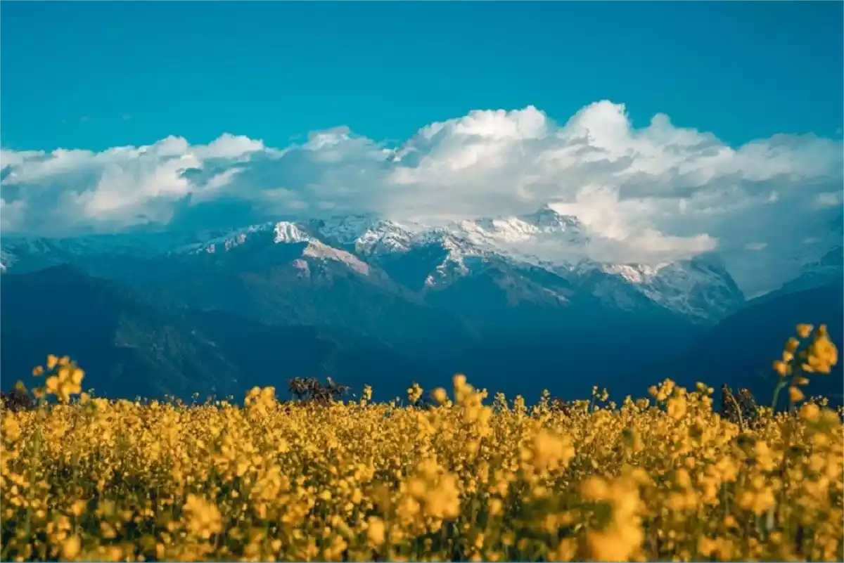 The best hiking season besides autumn is when rape blossoms, cherry blossoms, and azaleas complement the snow-capped mountains, creating a magnificent scene.