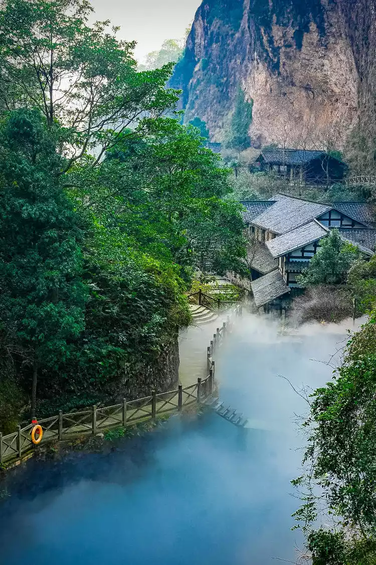 The plank road winds its way along the mountainside, like a flowing ribbon wrapped around a verdant cliff, seamlessly blending into the surrounding natural landscape, seemingly an extension of the natural cliffs, quietly blending into the surrounding mountain environment. Below, the plank road leads directly to Wolong Valley, where Wolong Pond lies, its clear blue waters and wisps of white mist creating a fairyland-like experience.