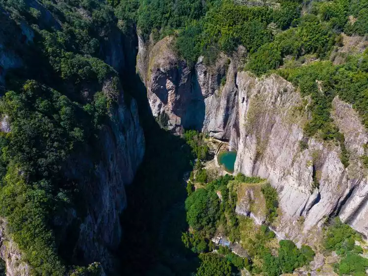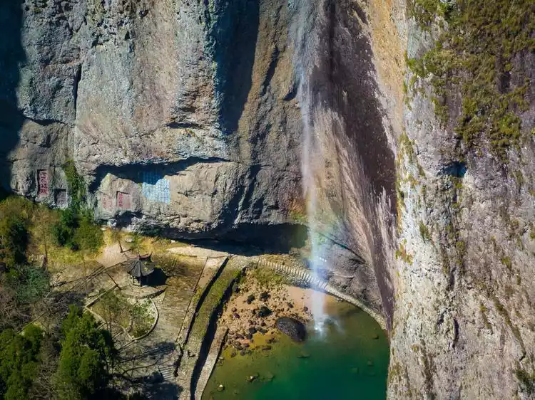 A peak rises, bifurcated at the top, resembling two slightly open crab stings, or perhaps a pair of large scissors. Entering Dalongqiu, the towering peaks, the inscriptions on the walls, and the silvery streams flowing into a clear, turquoise pool where koi swim, their bodies visible. Only then do you realize that the ancient saying, "all seem to swim in the air, with nowhere to rest," is truly true.