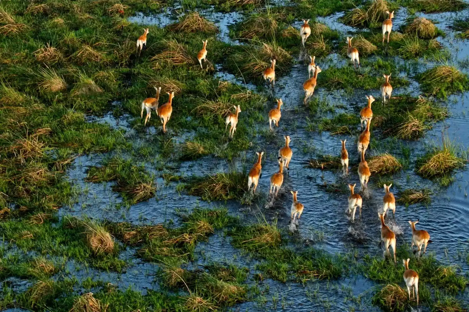 The Okavango Delta, with its abundant water resources and lush grass, attracts an astonishing number of wild animals to come here to feed and live.