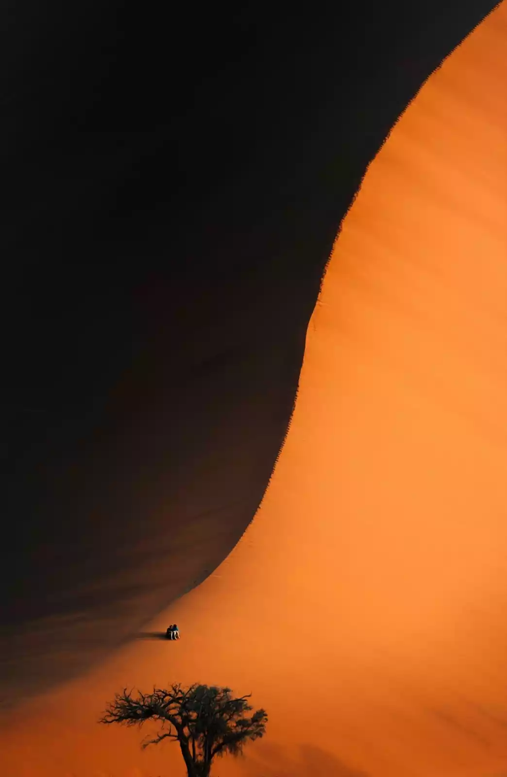 The sand and dunes appear red due to the high iron oxide content. The dunes are most beautiful in the morning and evening due to the change in color temperature.