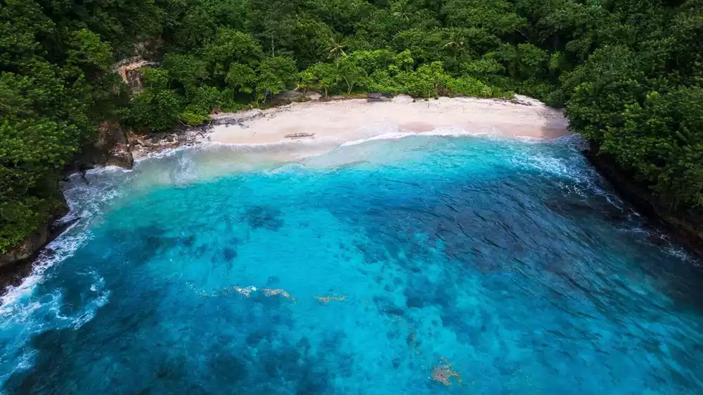 Bali's Fairy Beach is a hidden paradise nestled beneath sheer cliffs. Located on Nusa Penida Island in southeastern Bali, this beach is renowned for its spectacular clifftop scenery and crystal-clear waters. From above, the beach appears like a meticulously crafted work of art, creating a striking contrast with the surrounding lush greenery.