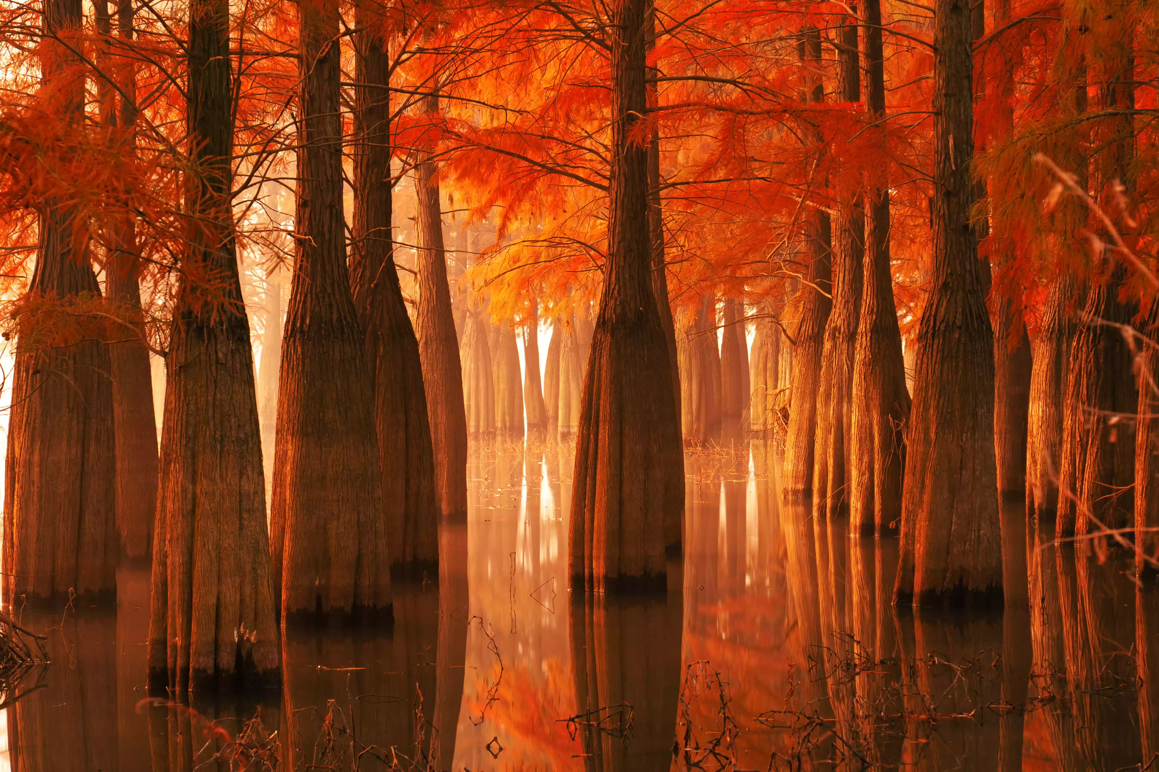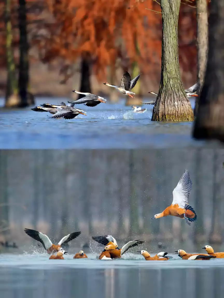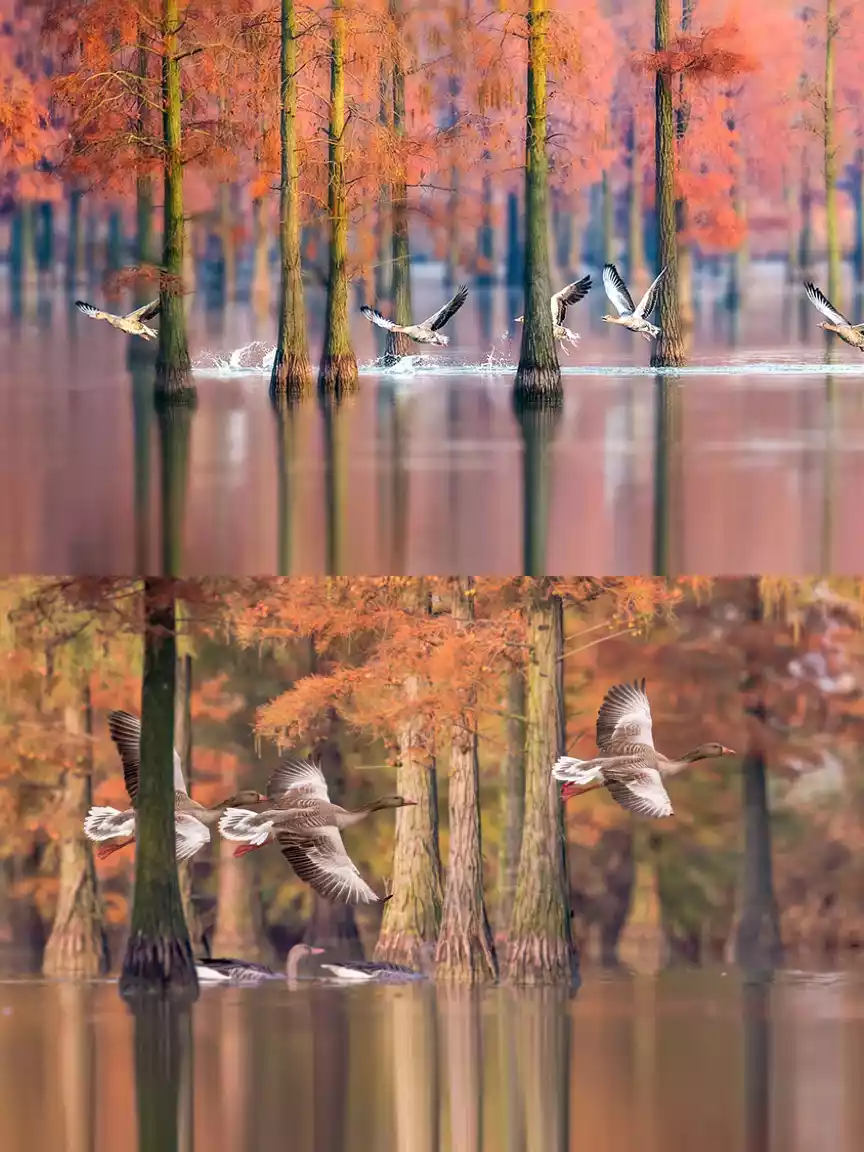 In late autumn, the Metasequoia trees along the lakeside gradually turn red, forming a sharp contrast with the emerald green of the lake, like a colorful oil painting. In the early morning or evening, a thin layer of mist often lingers over the lake, adding a touch of fairyland.