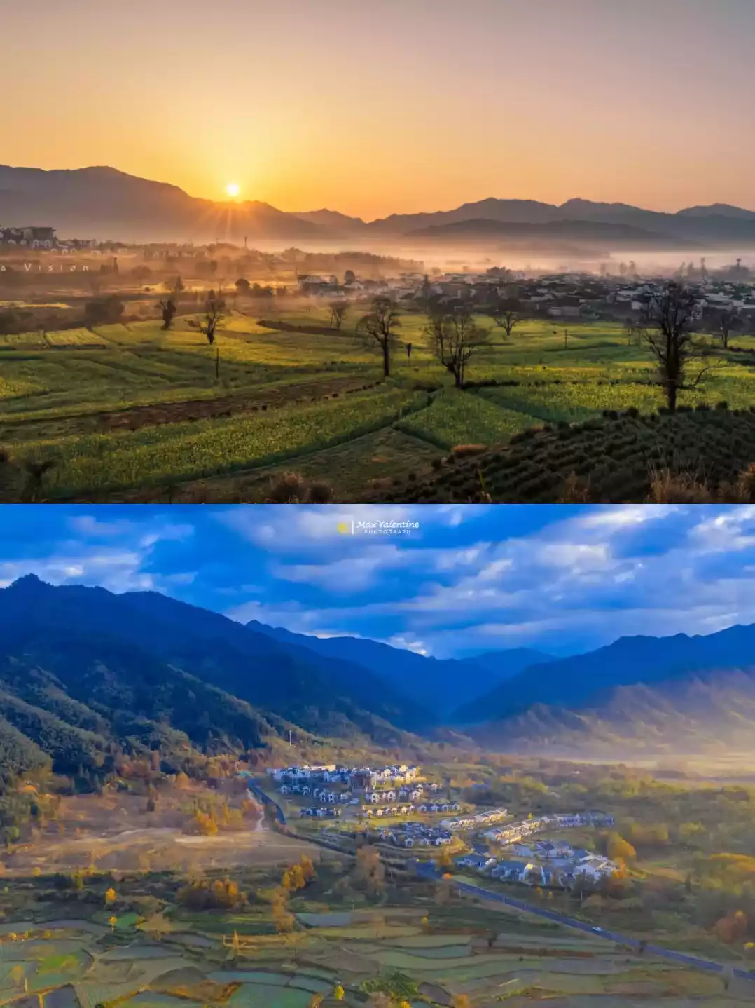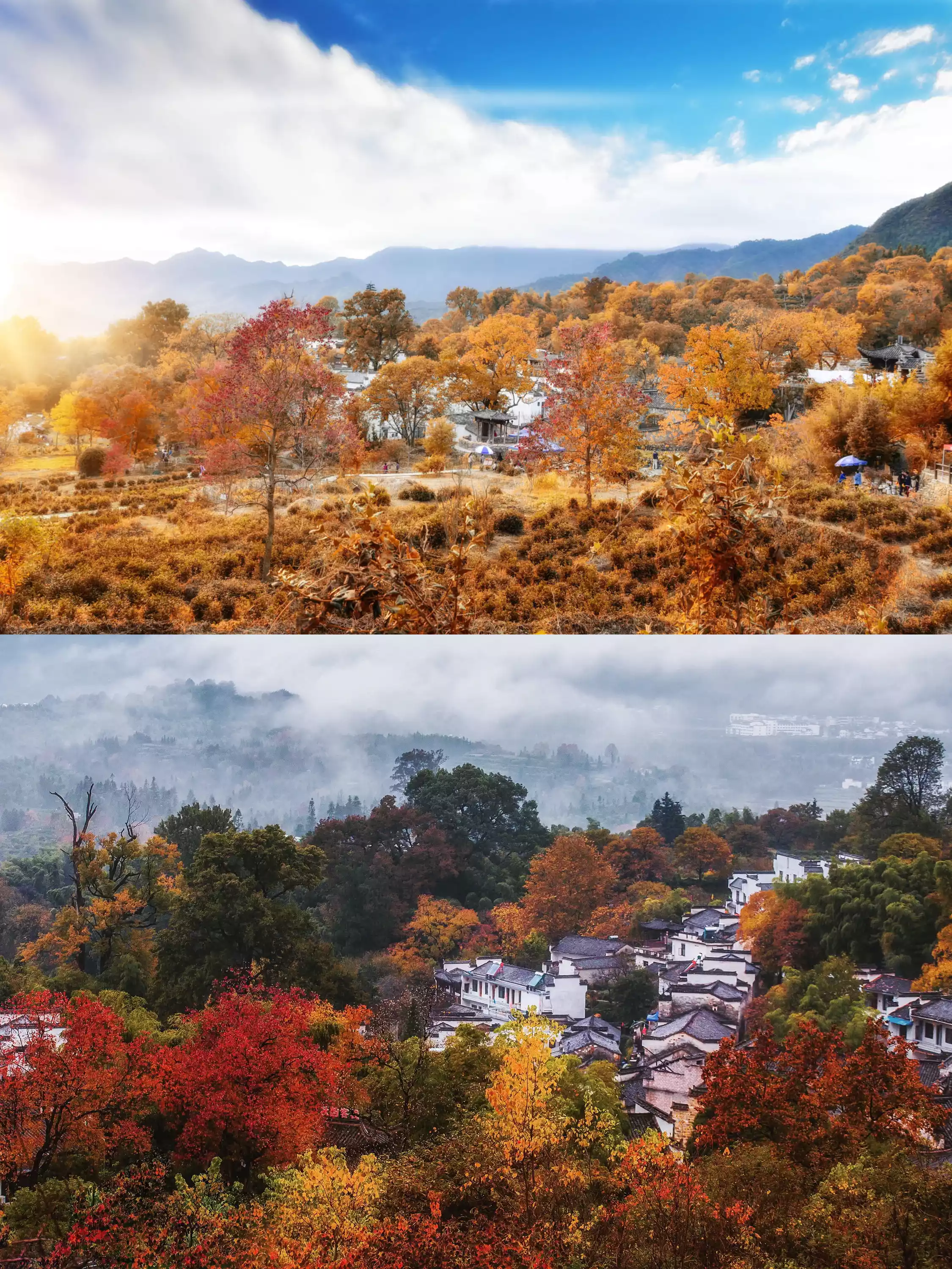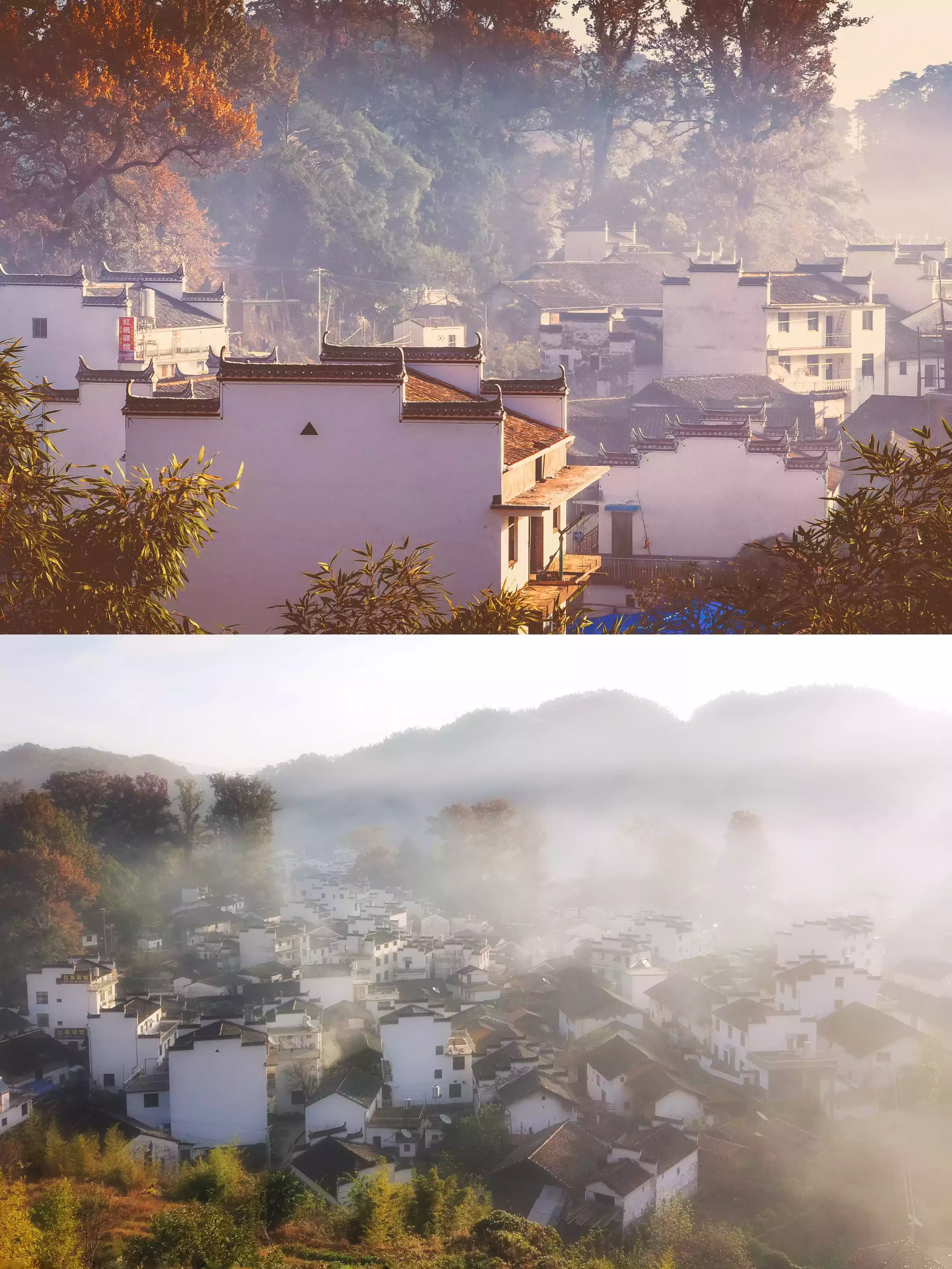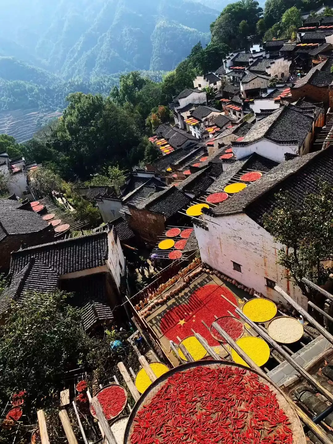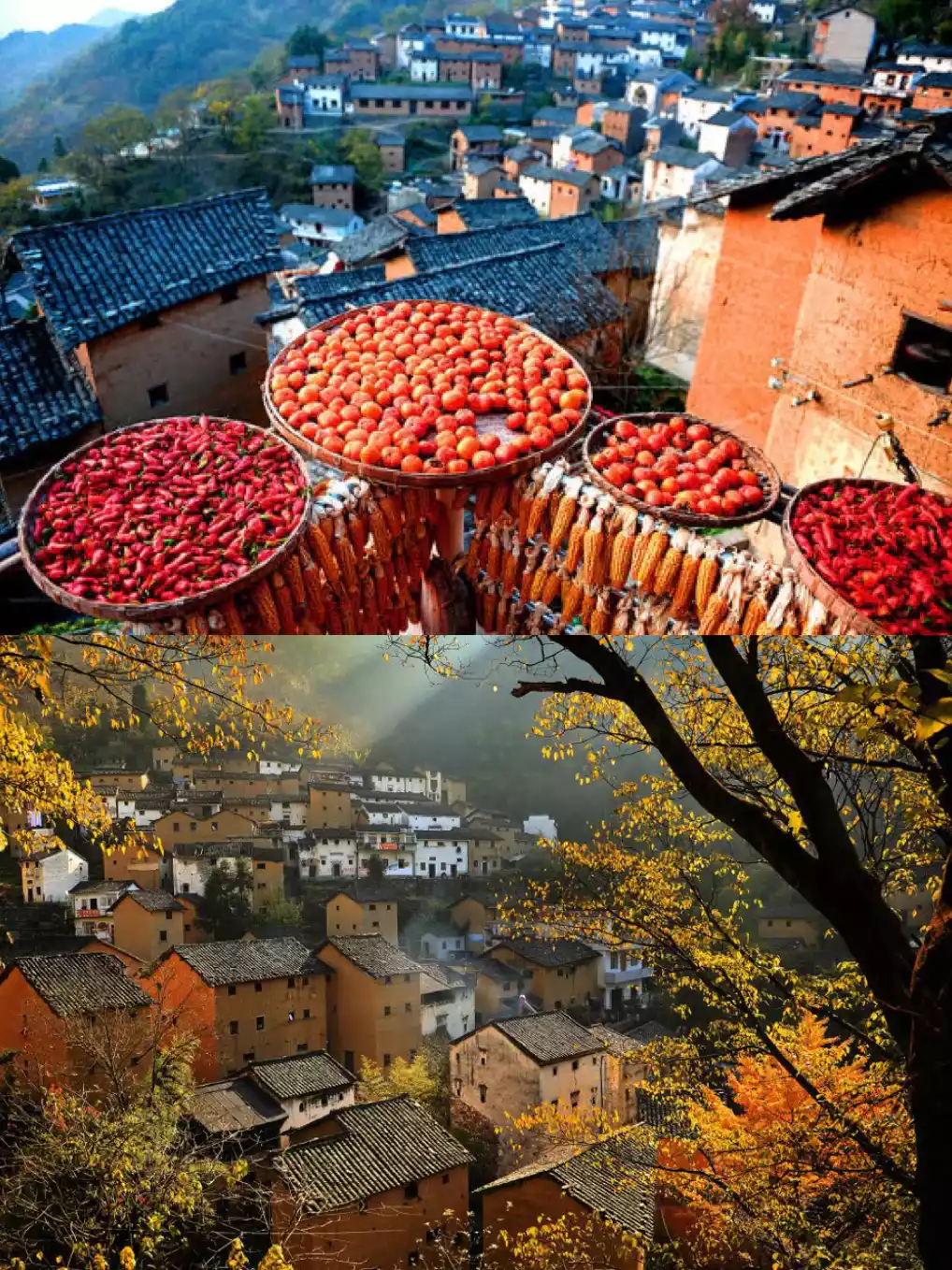 🌄In the morning mist and evening haze, when the white walls and green tiles are set against the red Chinese tallow trees and yellow ginkgo trees, every household dries out persimmons, beans, and peppers, creating a series of "Autumn Scenery of Huizhou".