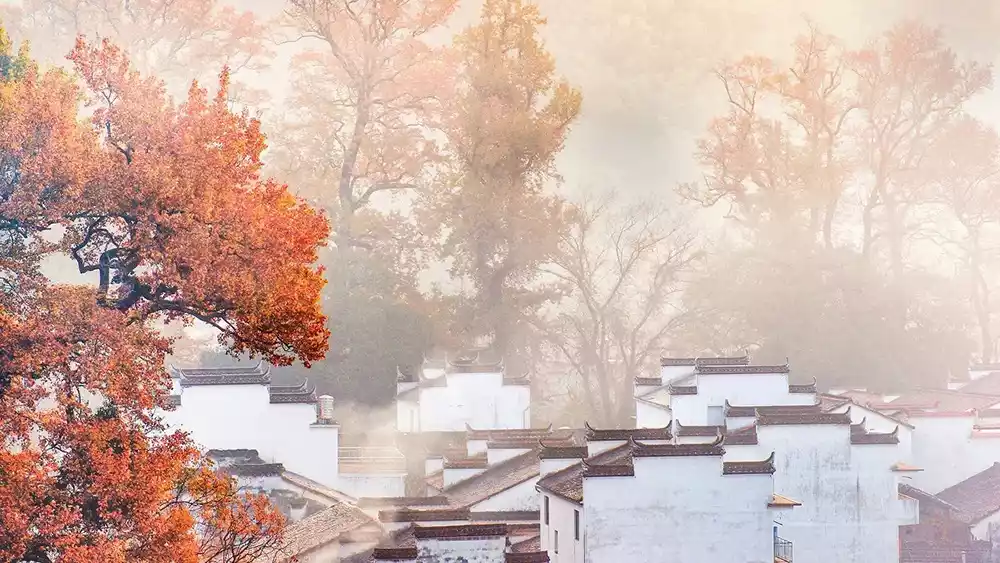 🍁Tachuan: The vibrant crimson leaves, the whitewashed, black-tiled Hui-style architecture, and the morning mist shroud the village in a fairyland-like dream, like a picturesque ancient village.