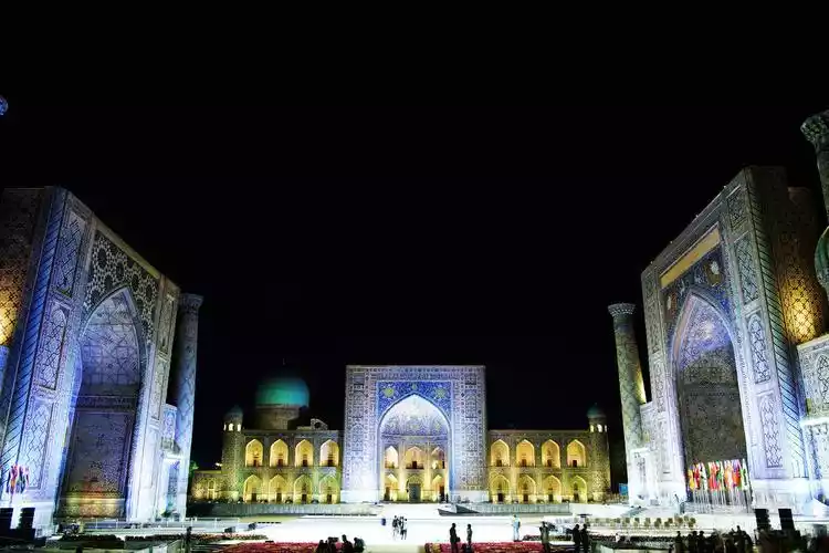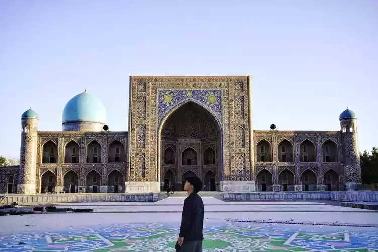 Rekistan Square, the most famous landmark in Samarkand, Uzbekistan, and even Central Asia, is known as the "Heart of Samarkand." It has been bustling and vibrant throughout history. Three madrasas (madrasahs) dot the square. The oldest is the Ulugh Beg Madrasah on the west side. The Sher-Do Madrasah, a similar-looking madrasah across from it, and the smallest madrasah in the center is the Tila Khari Madrasah.