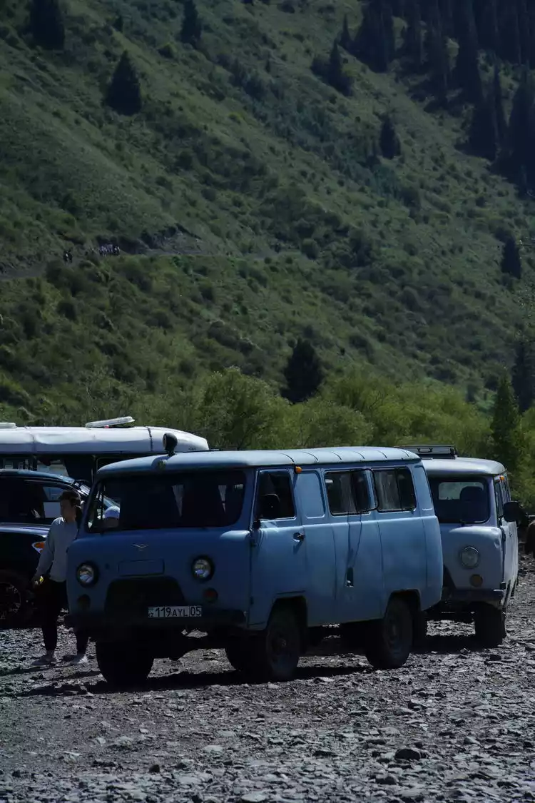 In the town of Saty, you can change to a Soviet steel cannon that is still strong. After climbing the slope, crossing the pits, and wading through the water, you will reach the parking lot of the scenic area after a shaky half-hour journey. Then you can choose to hike, ride a horse, or continue to spend 500 tenge to take the Soviet steel cannon to reach Lake Kaindi.