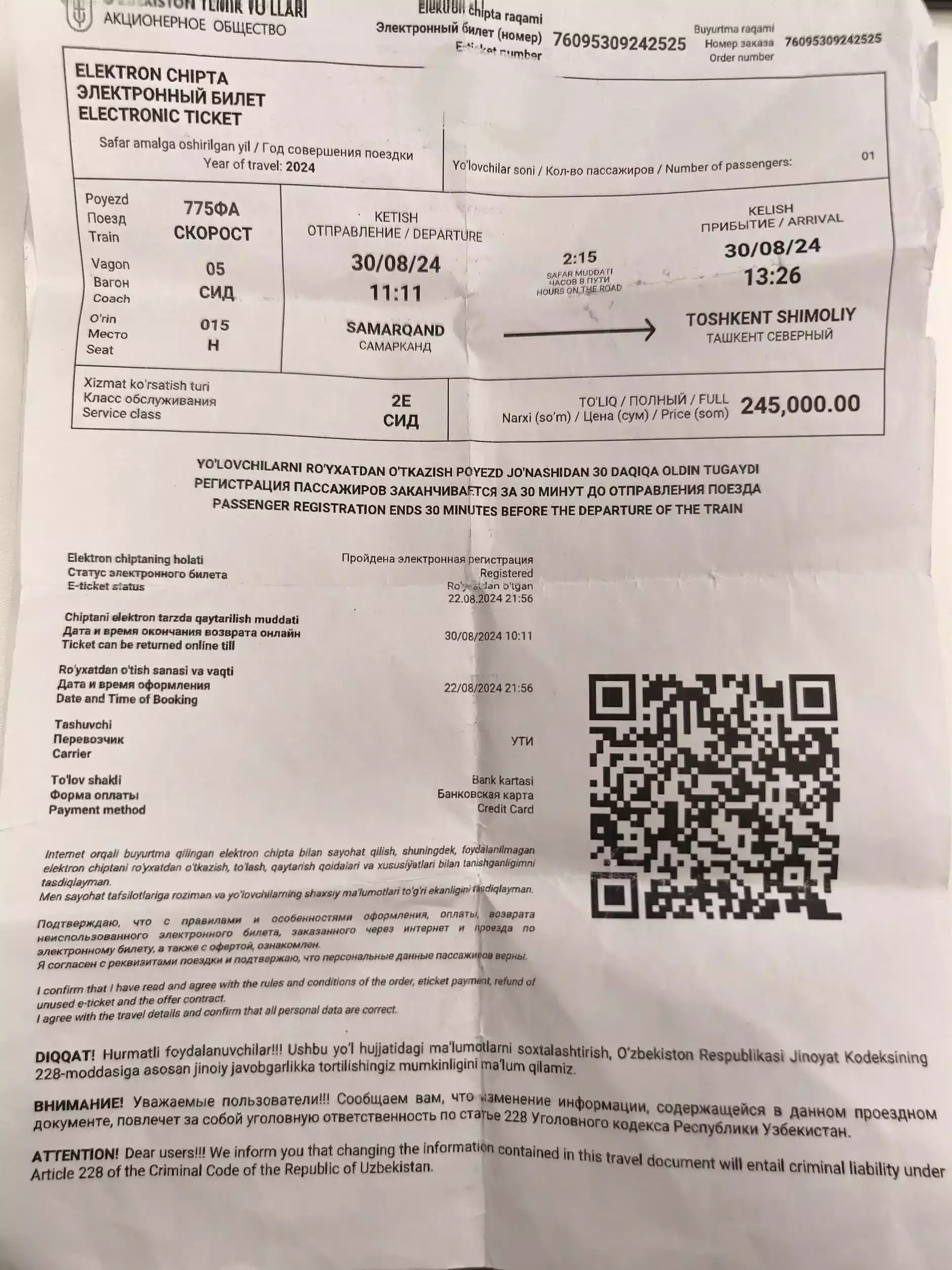 The Uzbek version of 12306 is very convenient and important for independent travelers. Intercity trains are definitely the most convenient. It also supports domestic mobile phone number binding and Visa payment.