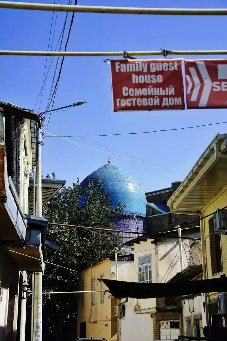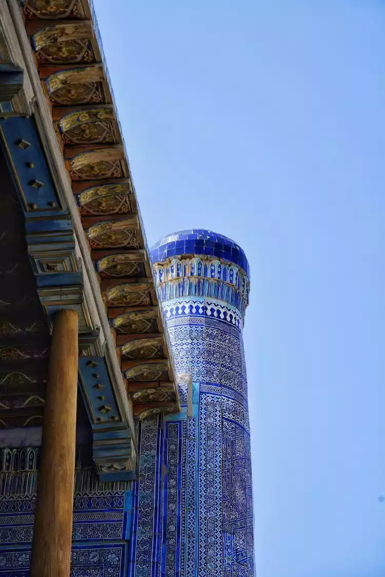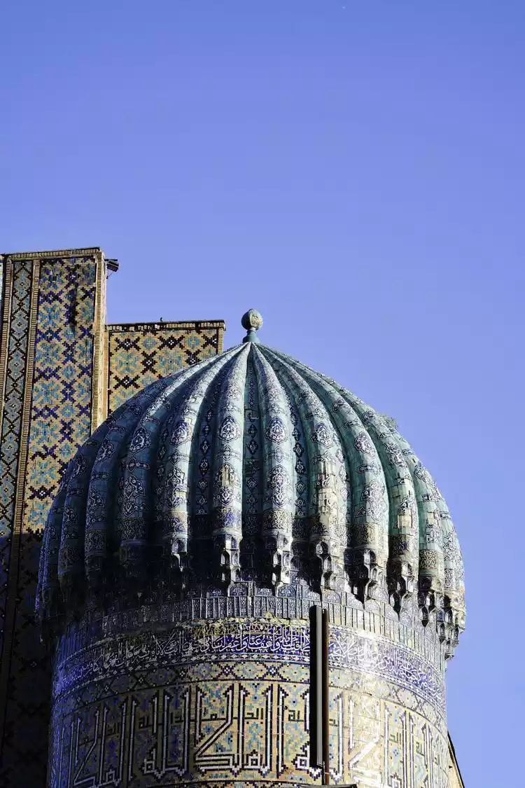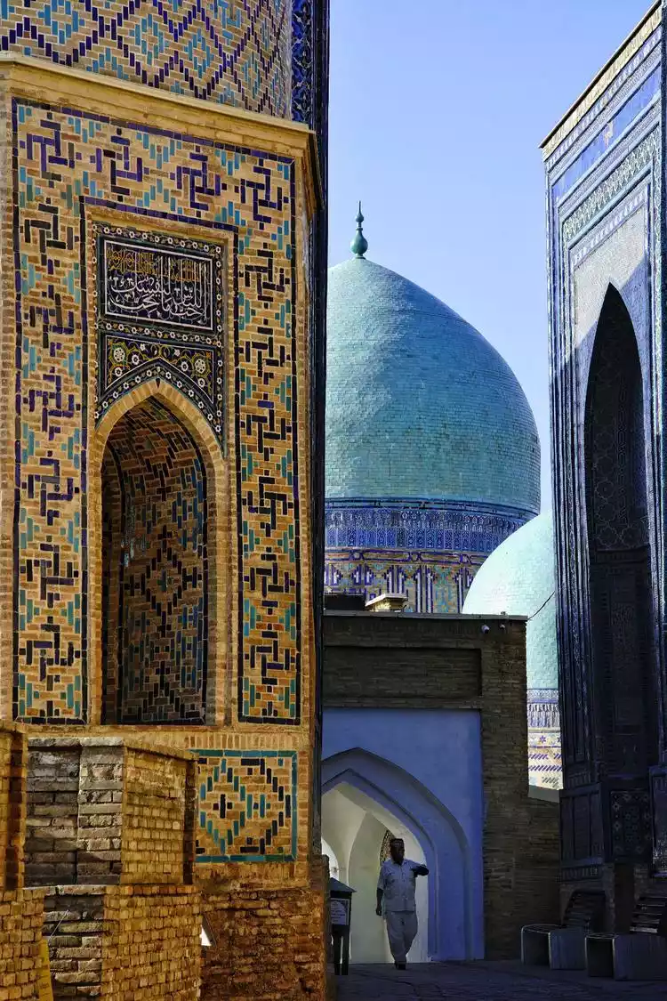 My favorite part is walking the streets of old Samarkand, where you'll occasionally stumble upon enormous structures. The low walls and buildings offer no protection from the sprawling seminaries of Rekistan and Bibihanem, which seem poised to break away. Imagine a blue dome poised amidst a forest of low-rise residential buildings—the contrast is magical!