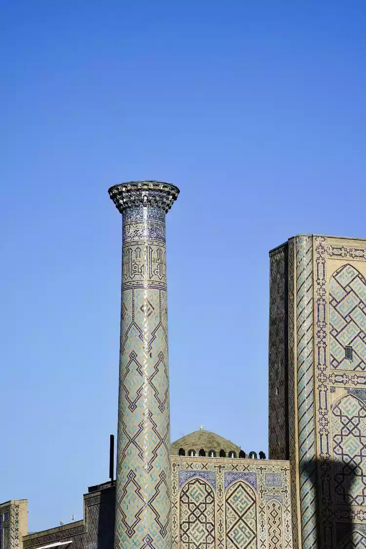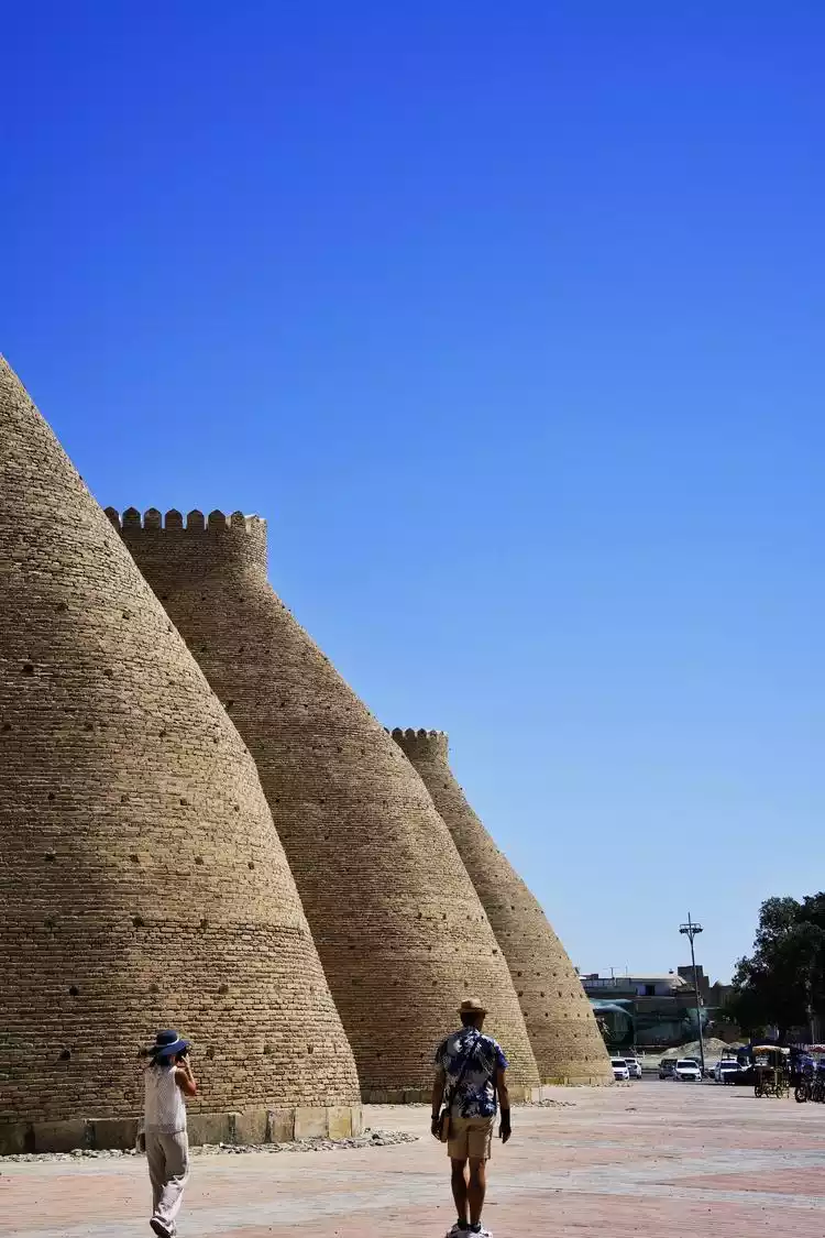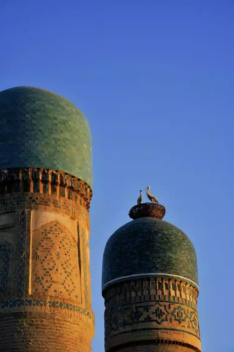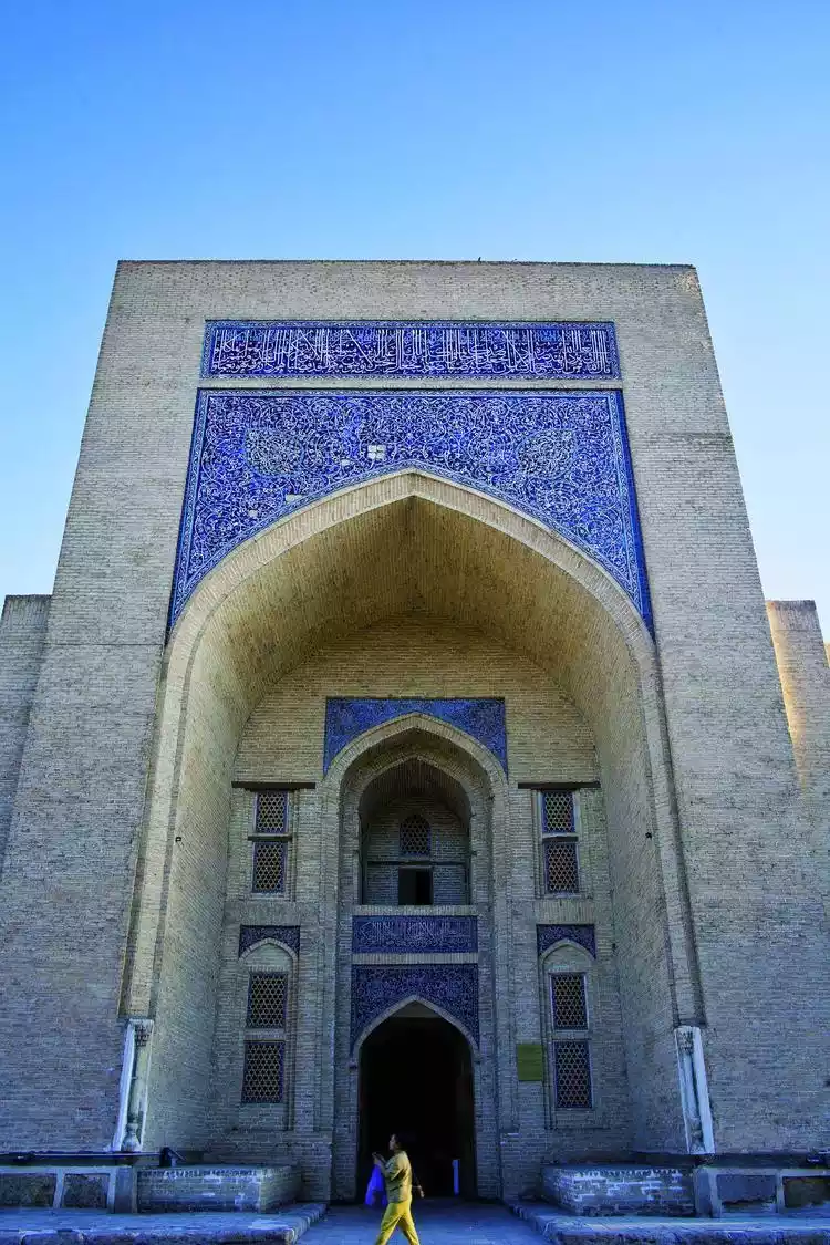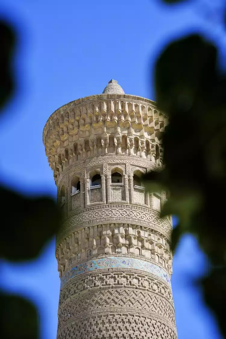 The massive tower is constructed from stacked bricks, and its structure is decorated with 14 different decorative bands of brick and earth from top to bottom. Its pristine simplicity is even more striking than the minarets of Khiva, which are covered in turquoise mosaic tiles. This minaret is the only structure in Bukhara that escaped destruction by the Mongol cavalry, and legend has it that even Genghis Khan was impressed by it.